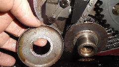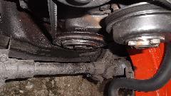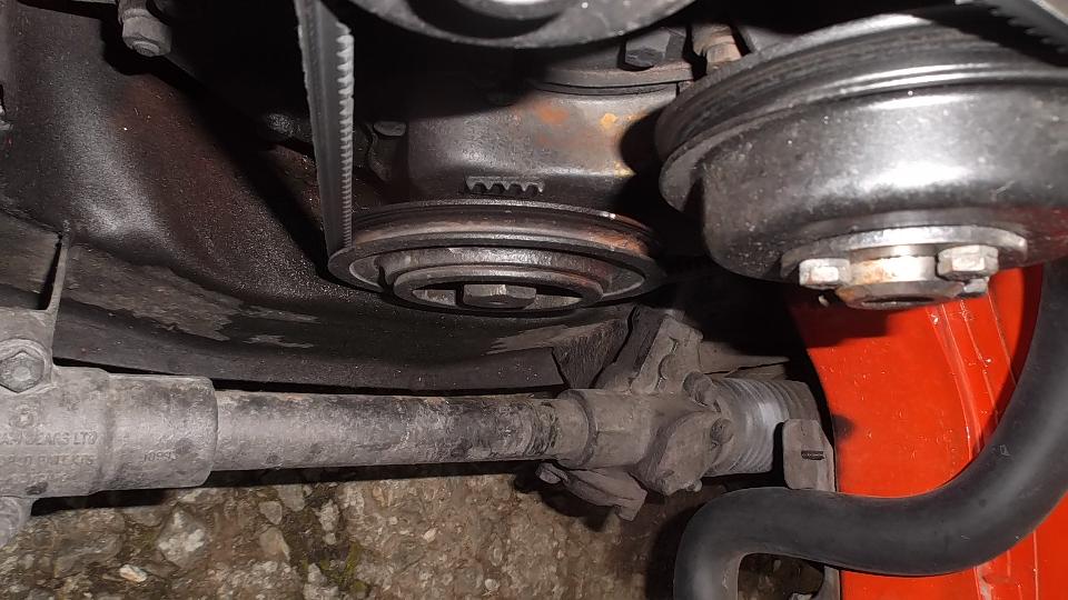We jacked the front of the MGA to investigate the cause of short steering motion. Didn't see anything obvious at first, except that the rack moved only 1-3/4 inches off center (should have been 3-1/2). So it was a good opportunity to fix two problems at the same time. The radiator was soon drained and removed, fan blade and water pump pulley and fan belt removed. Very soon the crankshaft pulley and timing cover were also removed. The type-A oil slinger would have to change to type-B to suite the change of timing cover.