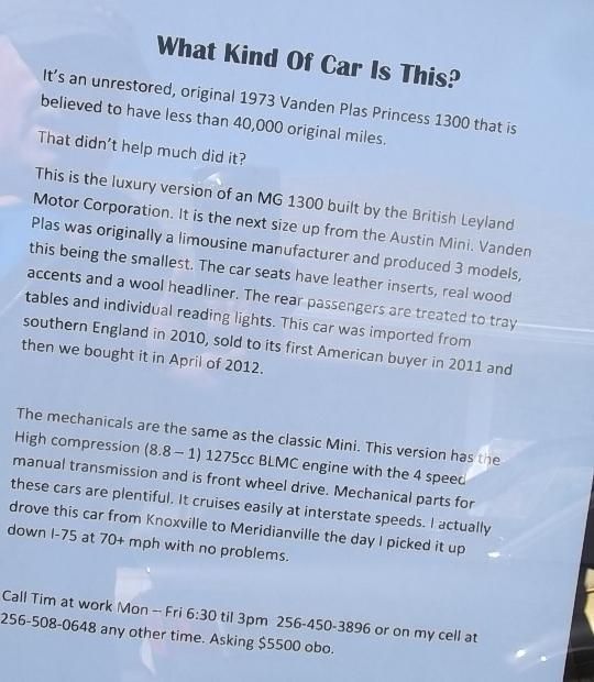 There was a nice (black) MGA Twin Cam here, as well as a seldom seen 1973 Vanden Plas Princess 1300. This strikes me as a luxury version of the Austin America I used to drive in the early 70's.