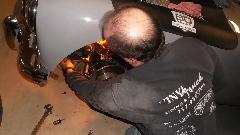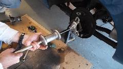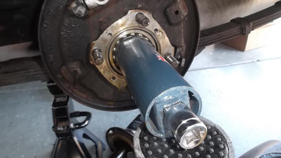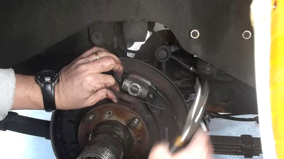 There was a bit of time for hot breakfast early in the day as we were contemplating replacement of the LR brake slave cylinder (leaking) and inspection on the RR (not leaking). After disconnecting the brake pipe, it was not difficult to remove a standard external snap ring from the LR slave cylinder (wrong retainer for this application). Likewise disassembling the brakes was only a matter of minutes. But then we had to start bringing out the big boys tools.