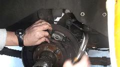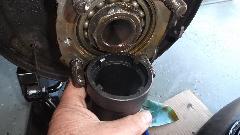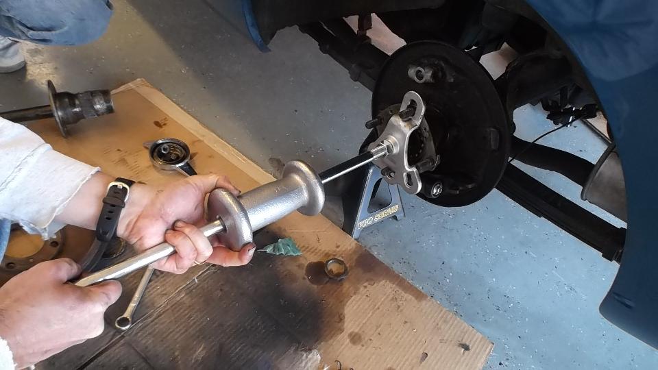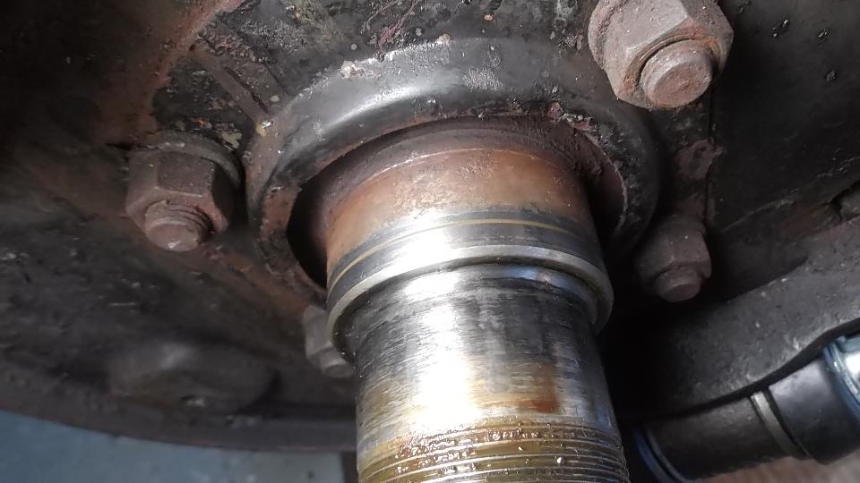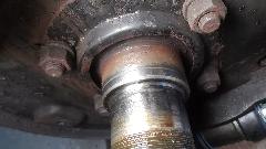 Then the rotating hub bearing was stuck on the axle housing (we come to expect this by now, right?). So off to the parts store for more big boy tools. This time it was a 5-pound slide hammer with the axle puller attachment. That did the job in short order, and the tool was returned for credit (the standard tool lending arrangement). Then we thought there was a wear groove in the axle housing that might shortly chew up a new hub seal. We were contemplating putting the job on hold pending procurement of a Speedi-Sleeve as the prescribed repair part. But on closer inspection, the mark on the housing appeared to be only discoloration from the old seal, as we could not feel any scratch here with finger tip of finger nail. So we decided to put it back together with a new seal. If it might leak later, then we get to do part of this over to install a Speedi-Sleeve later.