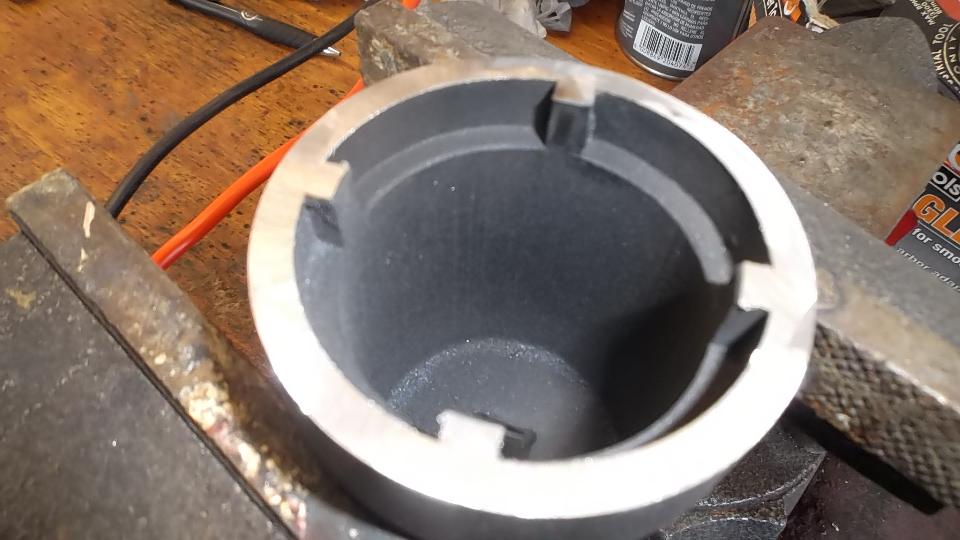 This was a special 4-keyed socket originally for use with front axle on 4-wheel drive Ford P/U trucks, 1995 or newer. This socket was previously reported to work for this job, but it too slipped off and chewed up four sides of the nut. Problem appeared to be a small bevel on the leading edge of the four keys. So more big boy tools, an angle grinder do grind away the end of the socket to banish the chamfer, and a Dremel tool to grind a bit from the inside diameter of the keys to better fit on the nut. But still this tool slipped off the nut again. Bummer.