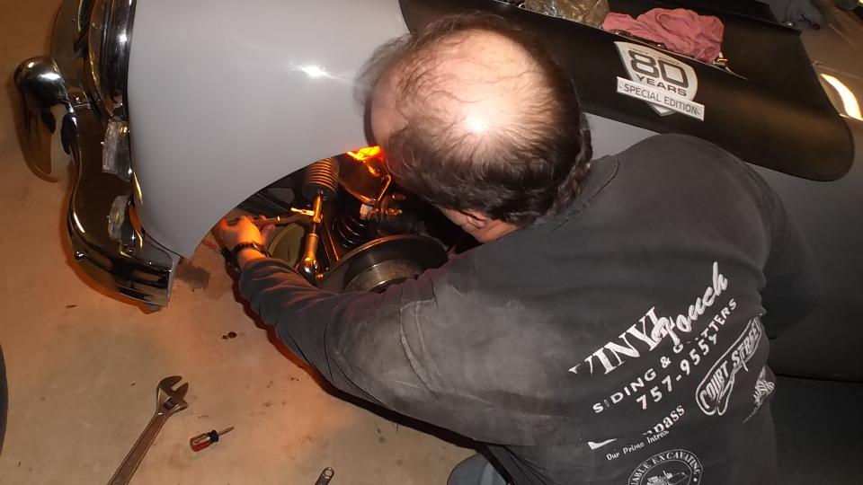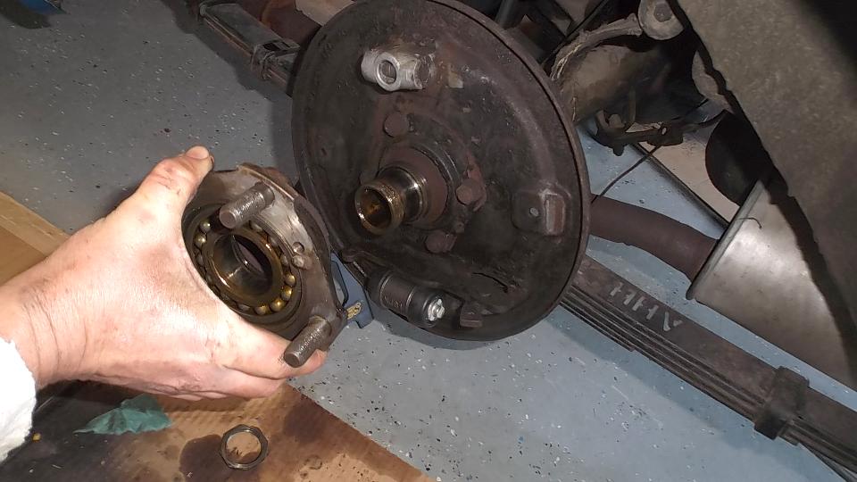 I missed a bunch of pictures while removing the big ball bearing from the hub to change the hub seal, but this procedure is well documented in the tech section of this web site. After reassembly we spent some time bleeding the brakes to get air out, and bleeding the clutch to get fresh fluid in (needs to be done every couple of years). We also drained the differential and installed new EP80W90 gear lube. Susie is now very happy (and Ralph as well) with what we hope will be brighter tail lights, quieter tappets, leak free valve cover, leak free rear hub, new rear brake shoes, and long life differential. Test drive disclosed a rattling sound which was determined to come from worn rubber grommets on the radiator fan attachment. Out those bits on the next parts order. Finish time was 7-pm, and ten hours is not bad for everything we did today (but it was a lot more work that expected).