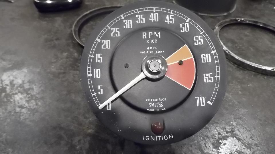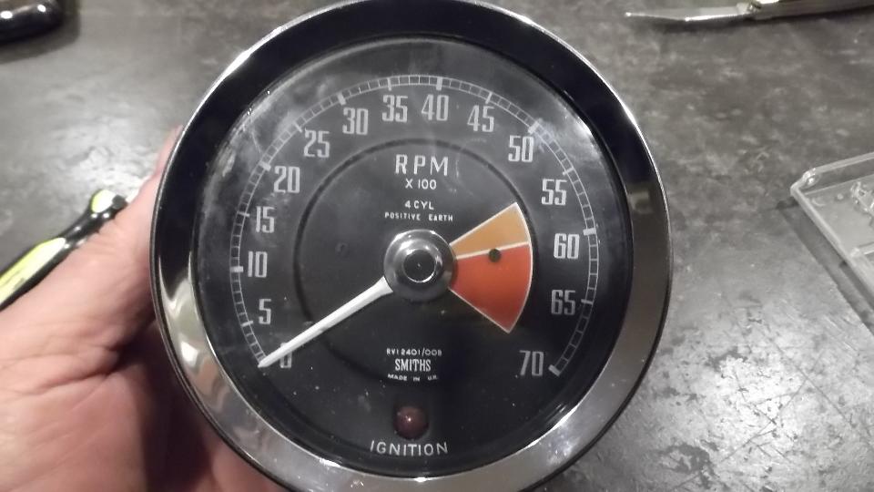 By evening we were calibrating the electric tachometer for David's MGB. Problem here is that the calibration potentiometer is inside, so the instrument has to be removed from the case for access. Twist and pull trim ring