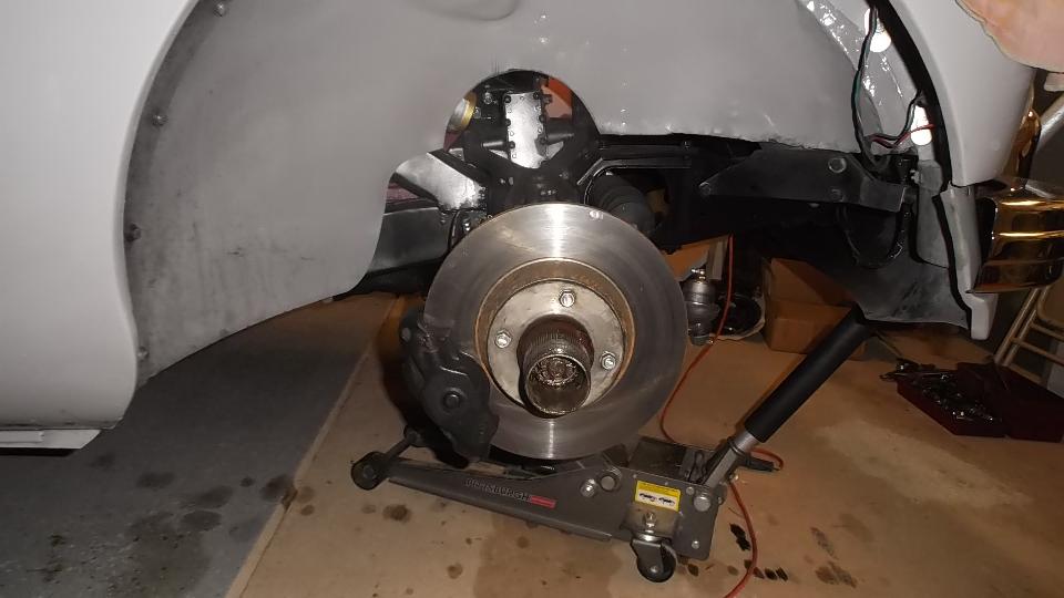 On closer inspection it was noticed that the brake caliper was hitting the lower suspension arm. Huh? Okay, the (asymmetrical) caliper mounting plates were on wrong side of the car, positioning the calipers too low. Once you figure out what's wrong, it's always something simple. Now we have tomorrow's job lined up to swap the caliper mounting plates and get it all reassembled.