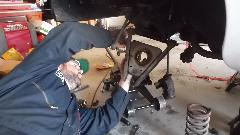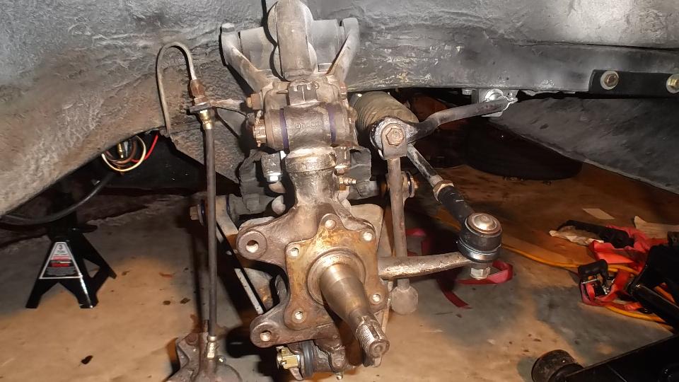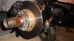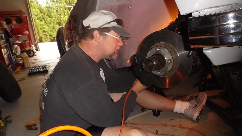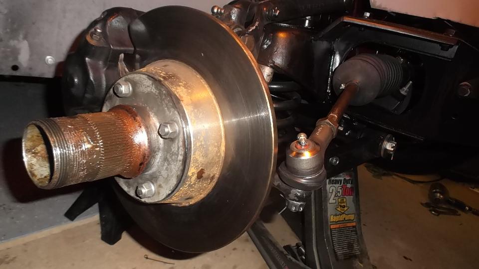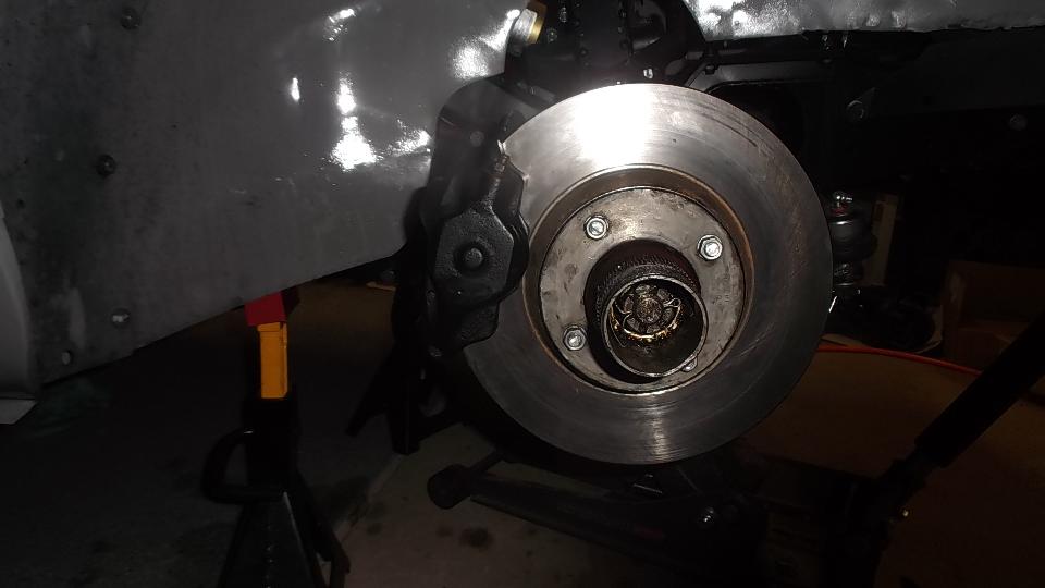 Installing brake dust shields we found two different length bolts. The lower bolts had to be shorter, as the longer ones would bottom out against the tip end of the steering arm bolts (on the same axis). On prior disassembly we had found no shims in the wheel bearing assemblies, and the bearing retaining nuts were loose. But the inner race spacers were present so it was a simple matter to install correct shims to have tight nut and proper bearing running clearance. Brake rotors and pads in good condition, back together no drag, so it was out for a test dive a bit after 2-am. Good time to knock off for the night so Keith can get some sleep (and I can post the pictures).