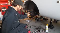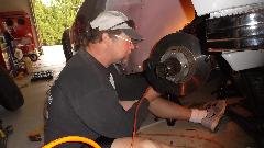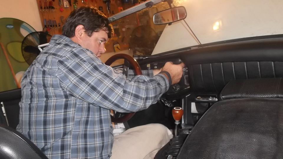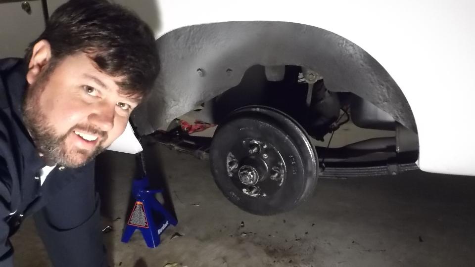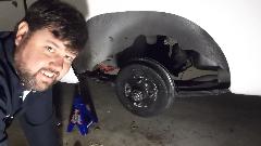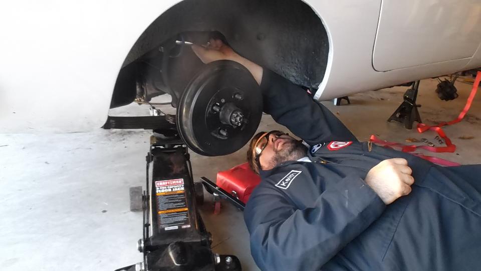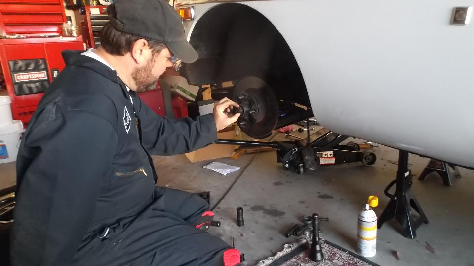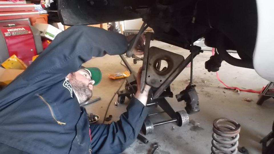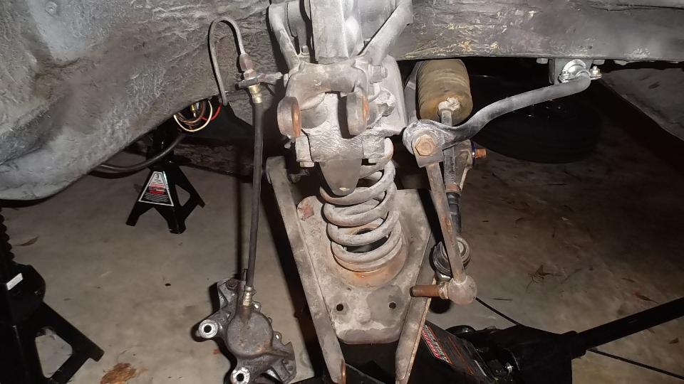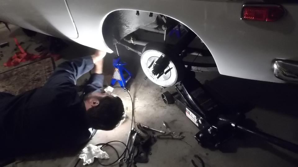 Then it went back together without too much hassle, finishing the left side at 11-pm, except leaving bolts loose until loading suspension later. Notice big grin. Good time to knock off, as there was to be a club tech session next day, here at Keith's place, so we could do the other side then.