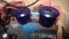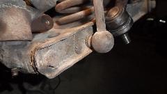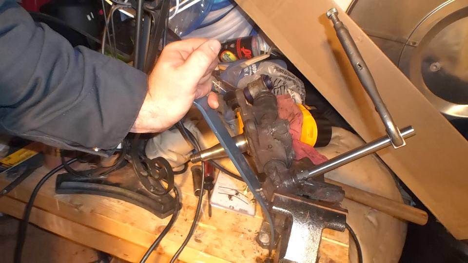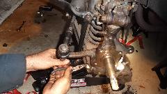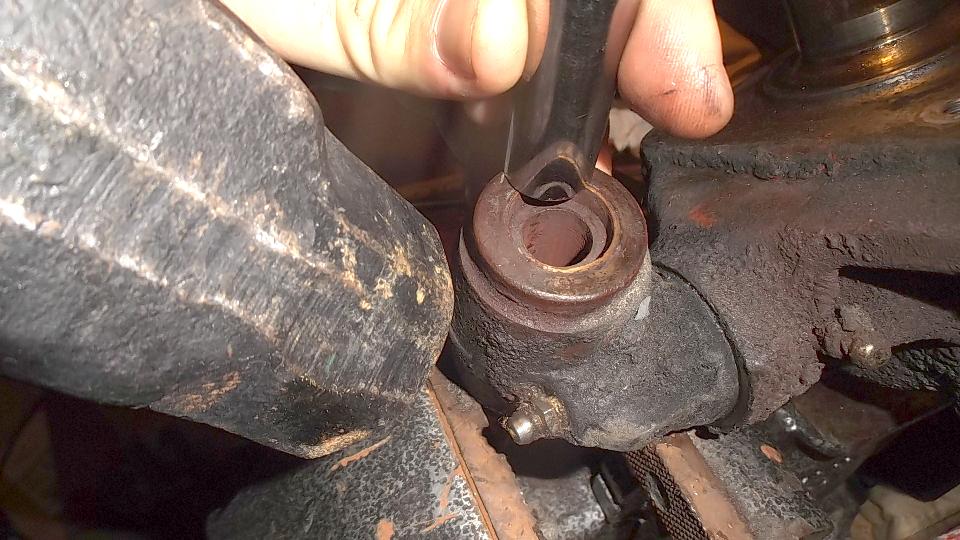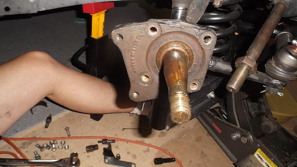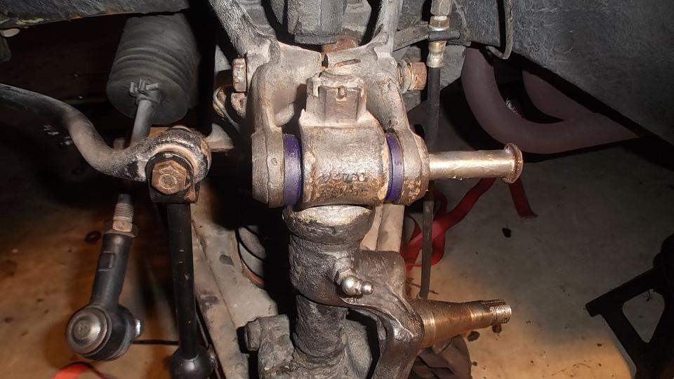 We were greasing the lower trunnion and kingpin bushings on the bench before going back in the car. Kingpin bushings were okay, so we left those alone. Lower bush on right side would not take grease. That turned out to be a clogged grease nipple I managed to "drill" the dirt out of the bottom end of the nipple, and dig dirt out of the port down to the kingpin, so it finally succumbed and took the grease. The new polyurethane upper trunnion bushings (the purple bits) just squeeze into place with a thin steel tube inside, but do grease the bushings and bolt during installation. Needing to spread the shock arms a bit to allow the new poly bushings to enter. Also spread the lower A-arms a bit to get the new trunnion seals in place. Did I mention everything on this car came apart with 5-lb-ft torque and a light tap with a mallet? We put it all back together with the proper specified torque.