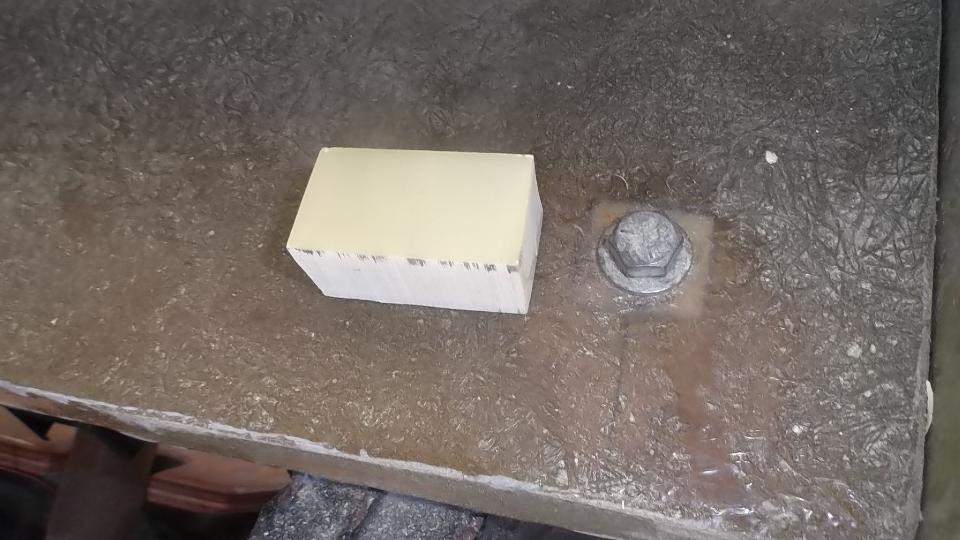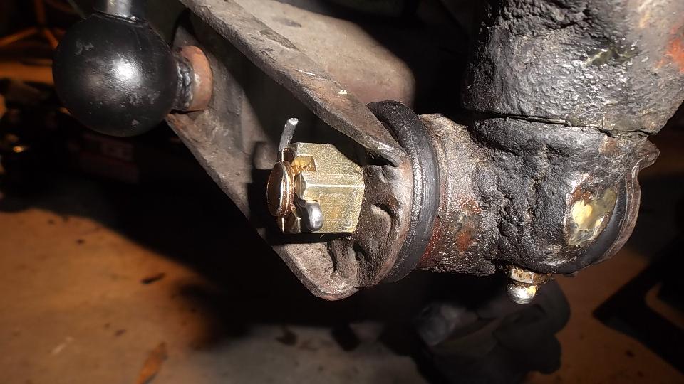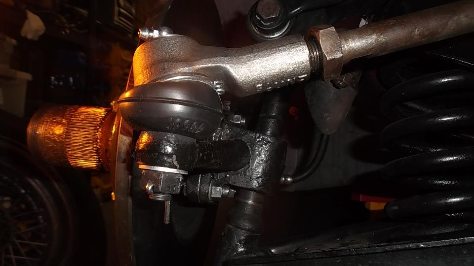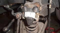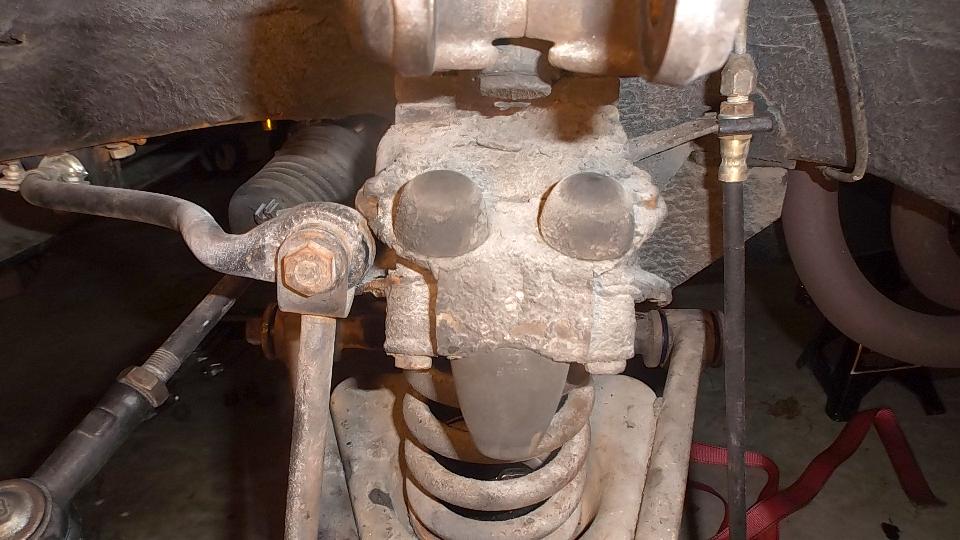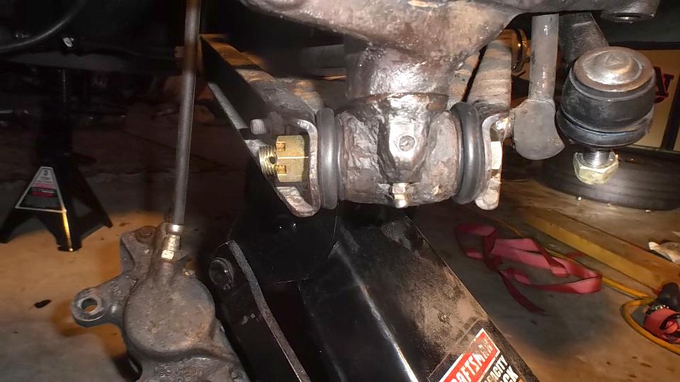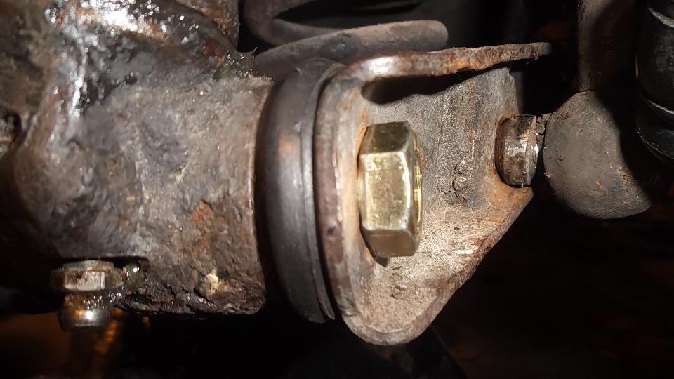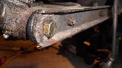 The new lower trunnion bolts and castellated nuts were a treat. On the left side the nut pulled up to the cross hole with no washer. Inspection reveals both A-arm brackets were previously repaired with a welded washer which adds thickness to the arms. On the right side no weld repairs, standard single thickness A-arms, so the castellated nut screwed on way past the cross drilled hole. Solution here was to place a lockwasher under the nut as a spacer, after which the split pin was properly located.