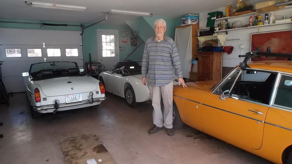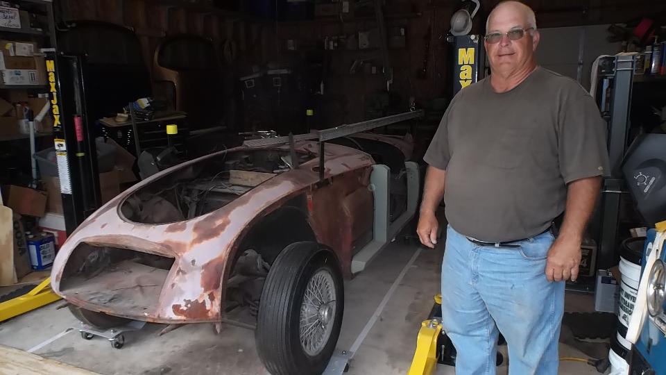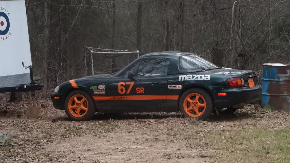 While making his own inner sill panel he fashioned a hole flanging punch and die from handy materials. The #67 Miata is a special built rally cross car, something his son got him hooked on. And by the way, Charlie will be sticking a Miata engine into this MGA.