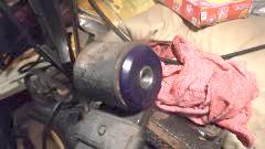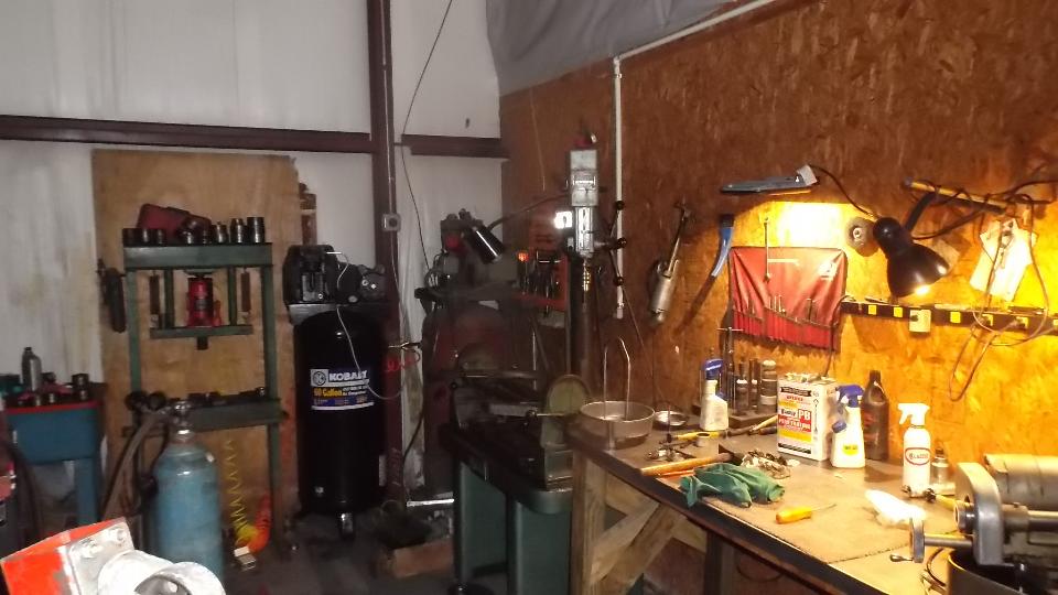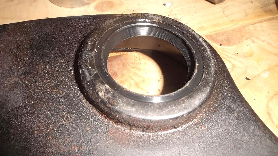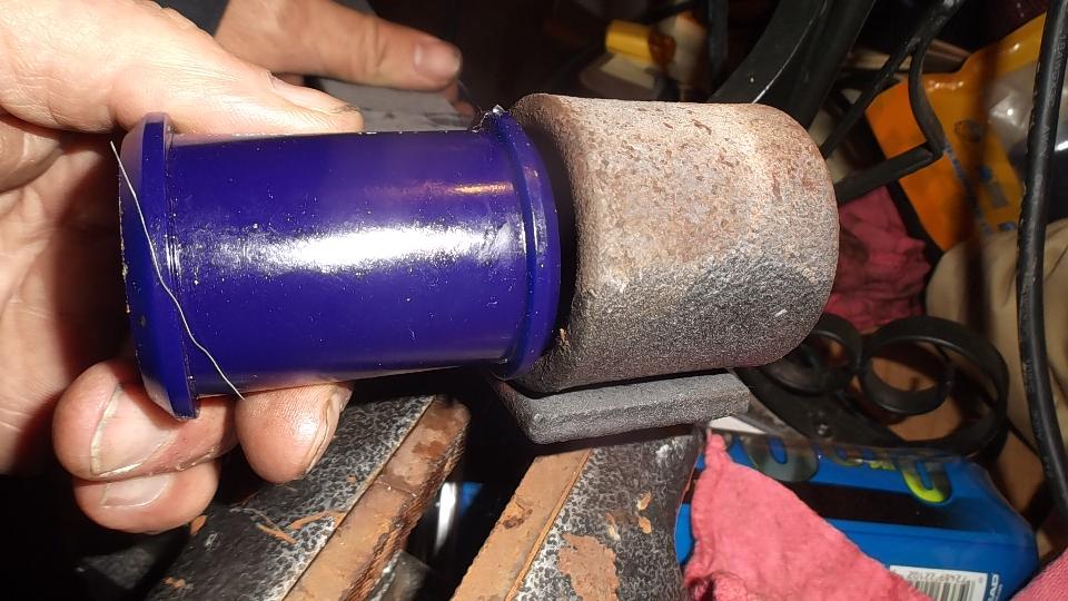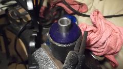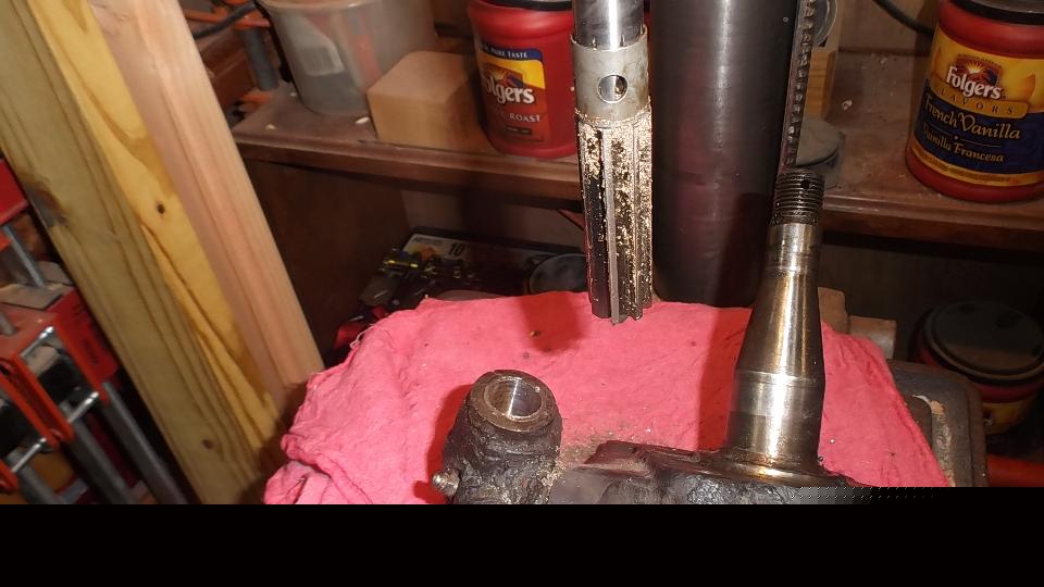 A lot like working second shift these days. Sleep late, catch the news, go to work in the evening. The chucking reamer had arrived, so we were back to work on Keith's MGB to finish the front end rebuild. He has been driving it for a year, but didn't try greasing it I guess. The lower trunnion bushings were dead dry, hadn't had grease for years. Kind of lucky we managed to knock the bolts out for disassembly. Left side distance tube came out with mild persuasion, but once the dirt was cleaned out it was loose as a goose. Right side distance tube required vigorous use of a two pound hammer for removal. That bushing was only a little loose but was badly scored. Zip a hack saw blade through one side of the ID to split the bushing and it comes right out. Driving the new bushings in is a bit tricky without a press (and an undersized bench vise), but we finally got them in (yes properly oriented to accept grease).