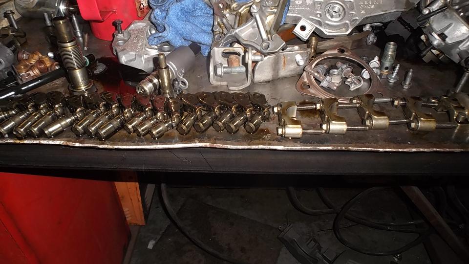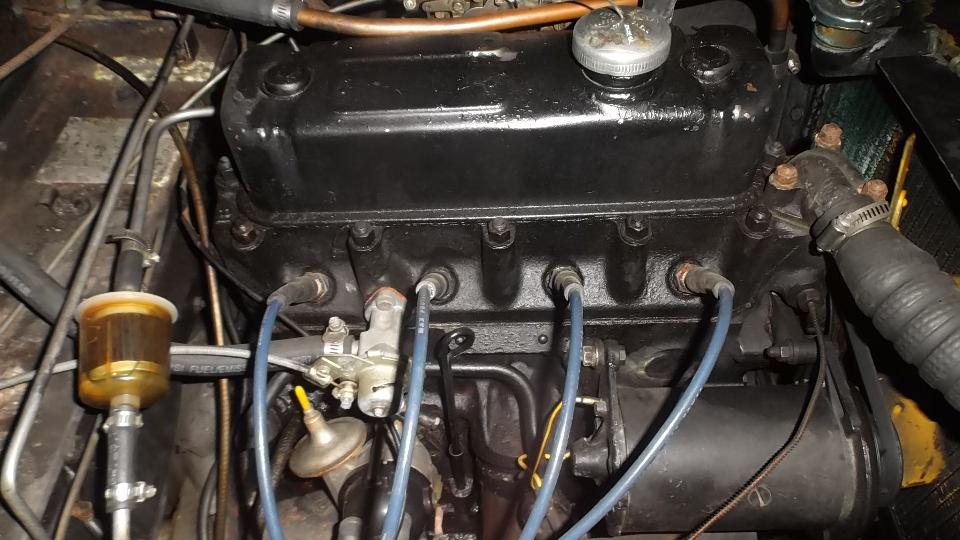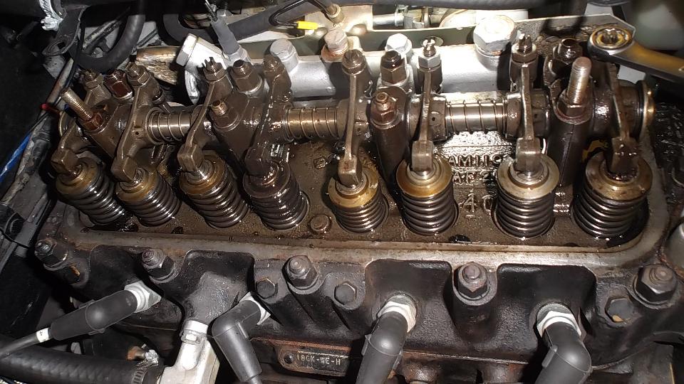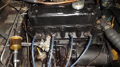 While that was curing we pulled the valve cover for a valve adjustment, as there was no record of it having been done, and the tappets seemed a bit noisy. We did find a few valves with excess clearance. Back together at 1-am, but no test run, as we opt to allow overnight for gasket sealer on the valve cover to set up. With all this fiddling around we didn't get to the original intended task of replacing the softened rubber pads on the front suspension cross member. Oh well, a job for another time perhaps.
