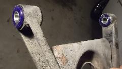 Otherwise we had a late start on the work today, as Keith had an unscheduled extra appointment after work. We did the 8-pm to midnight shift. Keith had a "complete front suspension bushing kit" with all polyurethane bushings. Time to swap some parts. Front wheels off, jack stands under the body, let the front suspension drop. Trolley jack under the coil spring to unload all of the suspension joints (except inboard A-arm bushings). Typical of "Grandpa's MGB", most of the fasteners could be undone with a nut driver (and Keith has been driving it for a year). Notice no seals on the outboard lower trunnion. The sway bar link lower bolt is always a challenge. Drive a screwdriver between the stud and bracket lower flange to stop rotation while removing the nut. Remove top trunnion bolt, then lower the jack to relieve spring force, and lift out the coil spring. Remove lower trunnion bolt (a bit of a challenge with heavy hammers) to take the kingpin and swivel knuckle assembly to the bench. Remove one more bolt in front bracket, and two large nuts on inboard pivot to remove the lower A-arm.