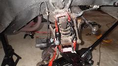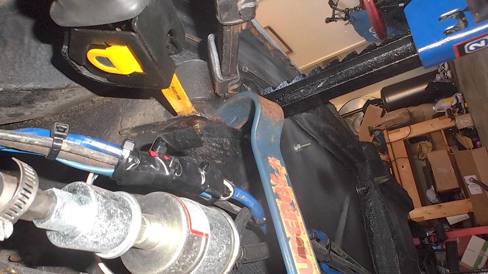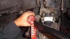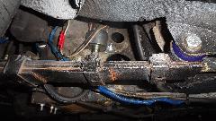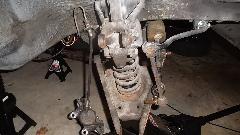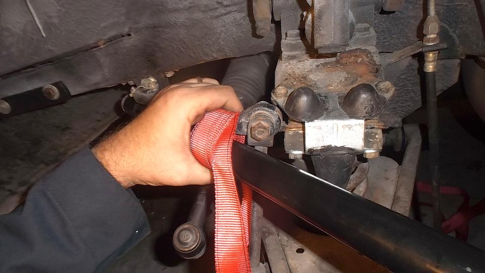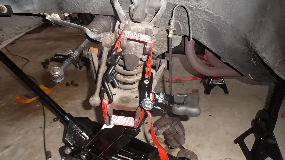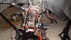 All was going well until we found the lower trunnion bronze bushing was badly worn (fairly common), and there were no parts for this in the "complete bushing kit". Bummer. Place an order with Moss Motors for two lower trunnion repair kits (will ship Monday, may not arrive until Wednesday). Meanwhile, we reassembled everything we could, and installed a cargo strap to hold the arms in place until we could get back to the lower trunnion later. (Yes I cheated and mirrored a picture from the other side).