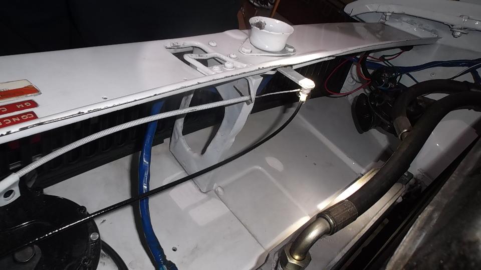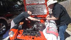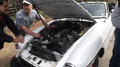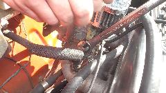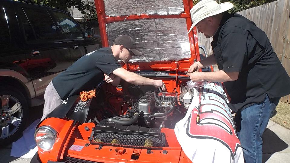 Well almost done. Dave figured this was a good time to install a new throttle cable, since the old one was binding intolerably. That's Brian Winter (left) giving him a hand. I think they got a few skinned knuckles in the process, but all is well that ends well.