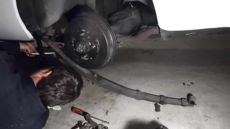 With a little supervision, and occasional extra hand on a wrench, Keith spent a good part of the day repacking the right side leaf spring with new poly bushings. This time the front bolt did not come out of the Silentbloc bushing so we had to resort to pry bar and Sawzall to cut the bolt both sides of the spring. Otherwise, done one the day before, so this one is easy peasy.