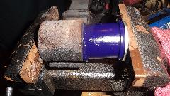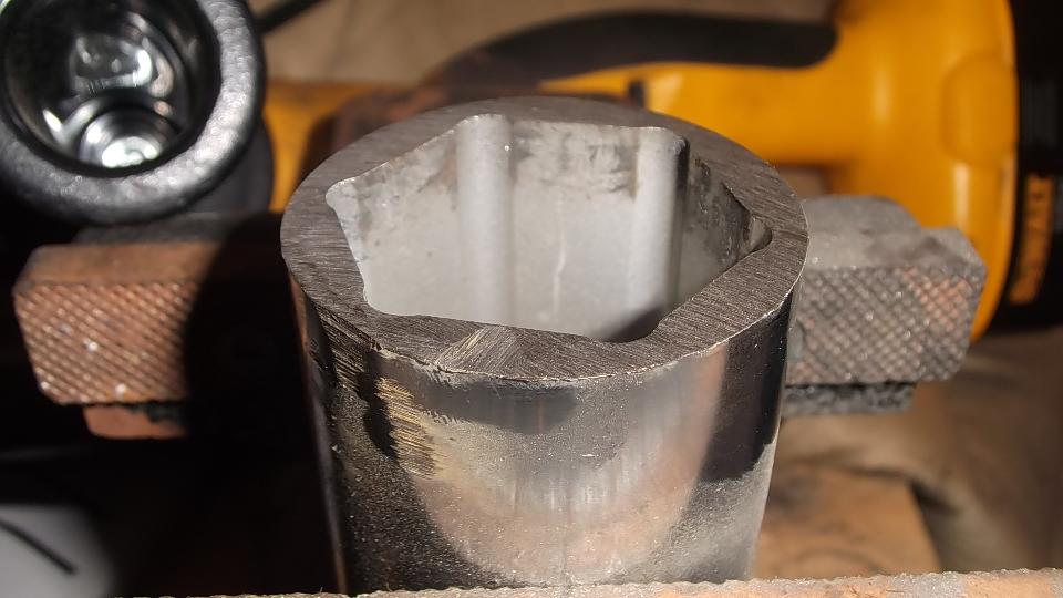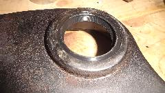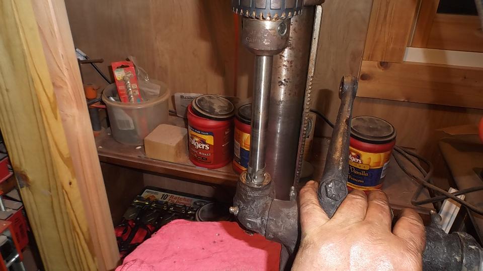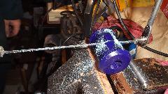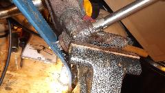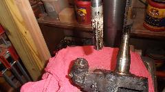 Reaming the bushings in the home garage is always fun (if you're a bit of a masochist). Wrap a bit of pipe strap around the shank of the reamer as a centralizing guide, and put the shank of the reamer through the bushing. Clamp the trunnion in the vise at appropriate angle, apply crowbar to the nose and to push backward (with vigor), and turn the shank with a Vice-Grip attached. The pushing thing can go easier if you place a bearing ball in the center of the reamer nose. Apply lots of oil, and turn clockwise only (never turn a reamer backward unless you like instant dull). When the little pipe strap is pushed out of the bushing you're done. Keep turning same direction as you pull the reamer through the bushing for extraction. This is not really the preferred method of using a reamer, but it works. For the second bushing we "cheated" and used the neighbor's drill press to turn the reamer while pushing the trunnion down. No crow bar involved, and only one guy sweating for half the time, and it was done, a couple of perfect 3/4-inch finished bushings.
