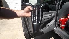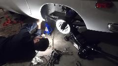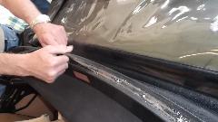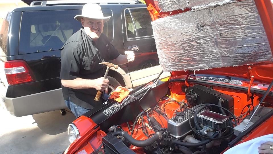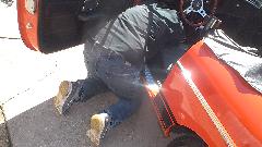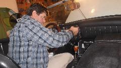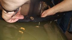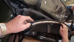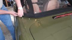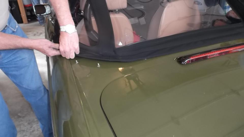 Pull the steel retaining bar from the back edge of the old top and insert it into the new top. Hook the bar into the teardrop hooks on the body, and connect the LTD fasteners and end hooks. Just a little problem here, as the fasteners on the new top do not line up with the mating fasteners on the car body. Not even close.