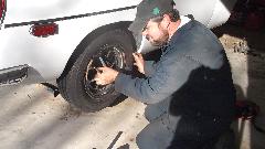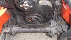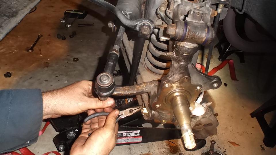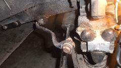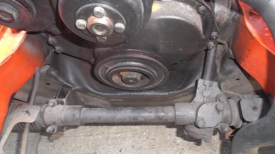 The replacement tie rod ends are too long, so we pulled those off to saw 1/4-inch off the end, grind square deburr, and reassemble. Tighten crankshaft pulley nut, install water pump pulley and fan, generator and fan belt. Get the radiator back in and fill with coolant. Fire it up, see drip, fix one hose clamp, and it's done.