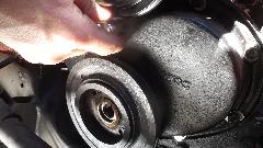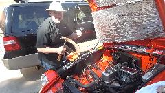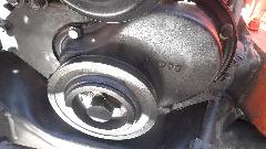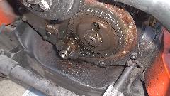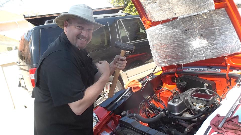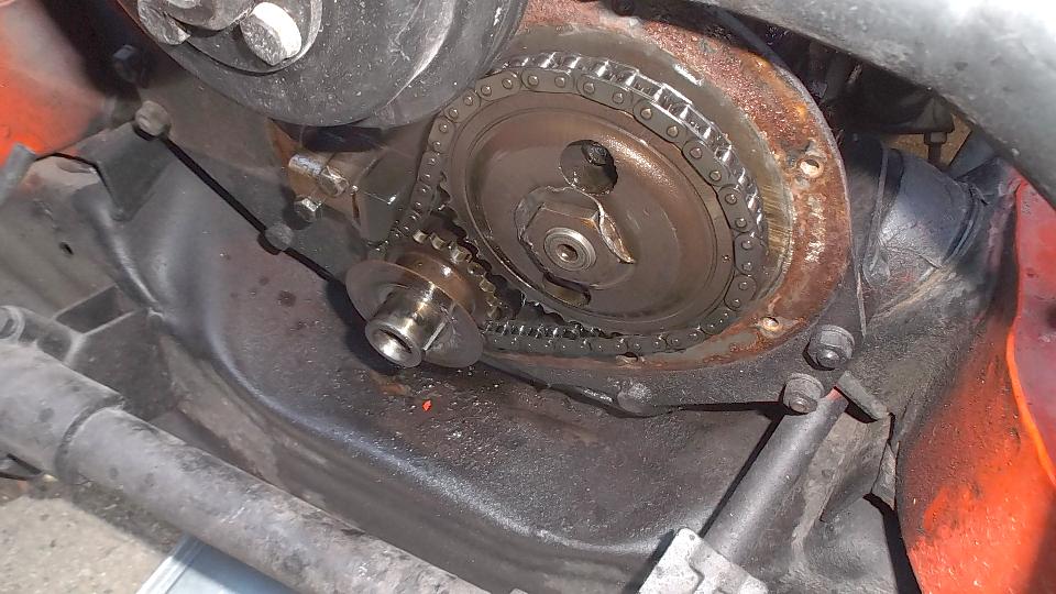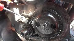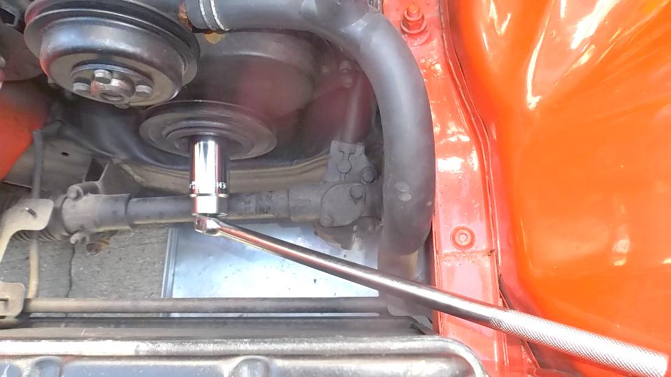 Then Dave and Tonya Arwood from Smith's Station, Alabama came along with their orange 1979 MGB. You may recall this one from the tech session two weeks earlier when we determined that the cam timing was off by one tooth on the timing chain. Today we would set this right. The late model MGB has good space between the radiator and engine, so the radiator does not have to be removed for access to the crank pulley and timing cover. Un-bend the locktab washer, grab a 1-5/16-inch socket (in this case 34-mm socket) and a breaker bar. Prop the breaker bar against the inner fender and hit the starter momentarily to loosen the crank nut (nice trick).