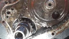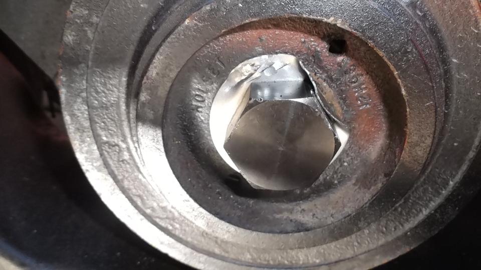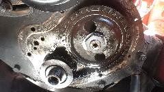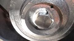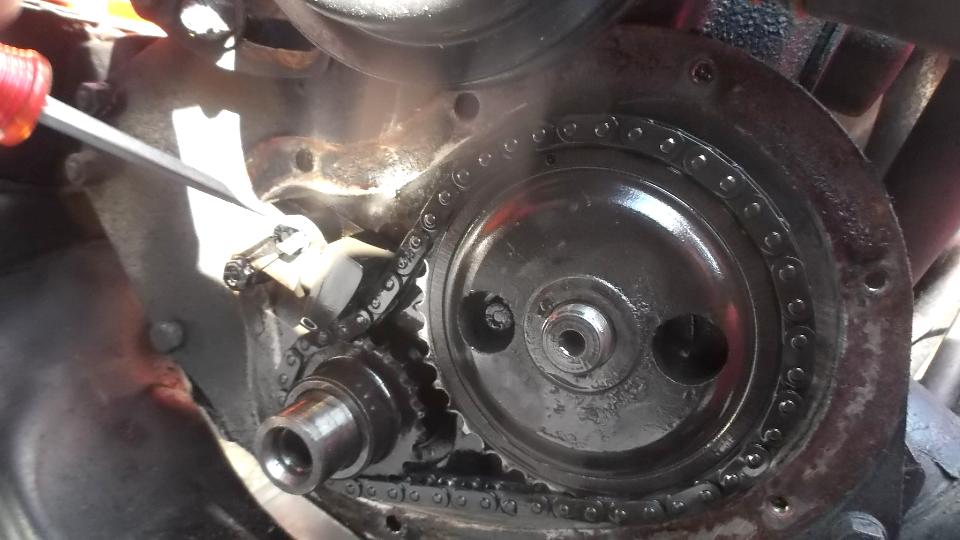 Upon removing the timing cover we discovered the oil thrower ring had been installed backward and was rubbing on the shell of the oil seal. No harm done, except we also found the oil seal sitting on the crankshaft after the timing cover was removed. Speculation thinks this may have been a result of the oil thrower ring rubbing on the seal, heating the seal, and possibly making the seal rotate in the cover. Of course the timing chain had been installed one tooth off, which is why we were here today. Right away Dave gets to use the hammer a couple of times, unbending lock tabs. When the new wrench socket slipped off of the cam sprocket nut, we were grinding the end of the socket down to remove the internal lead-in and get a square edge for better grip on the thin nut.