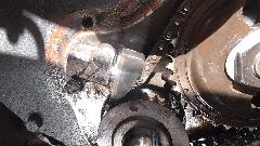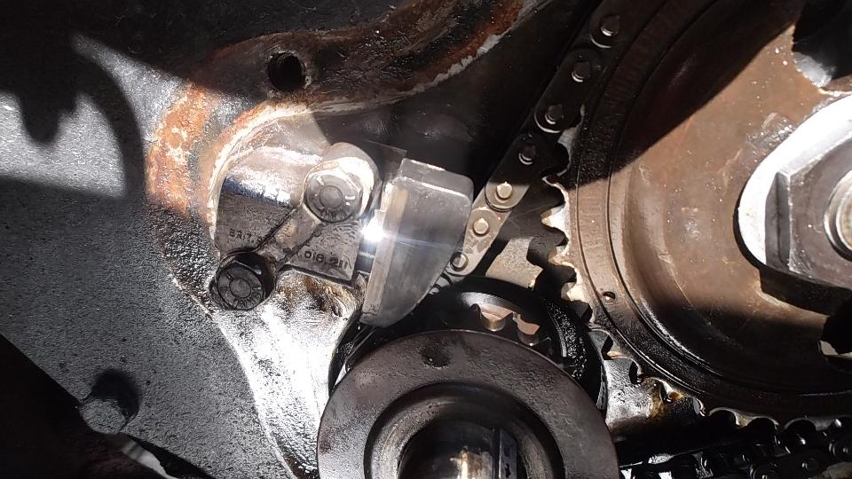 Dave gets to use an even bigger hammer to smack the socket to knock the lock tab washer totally flat. Then we use the same wrench trick on the cam sprocket nut, block the wrench handle against the inner fender and hit the starter to loosen the cam nut. Then unlock the lock tabs to remove two bolts to remove the timing chain tensioner (and do not lose the parts that shoot across the driveway when the spring is released).