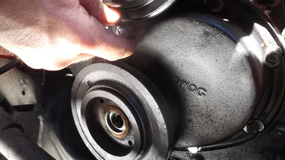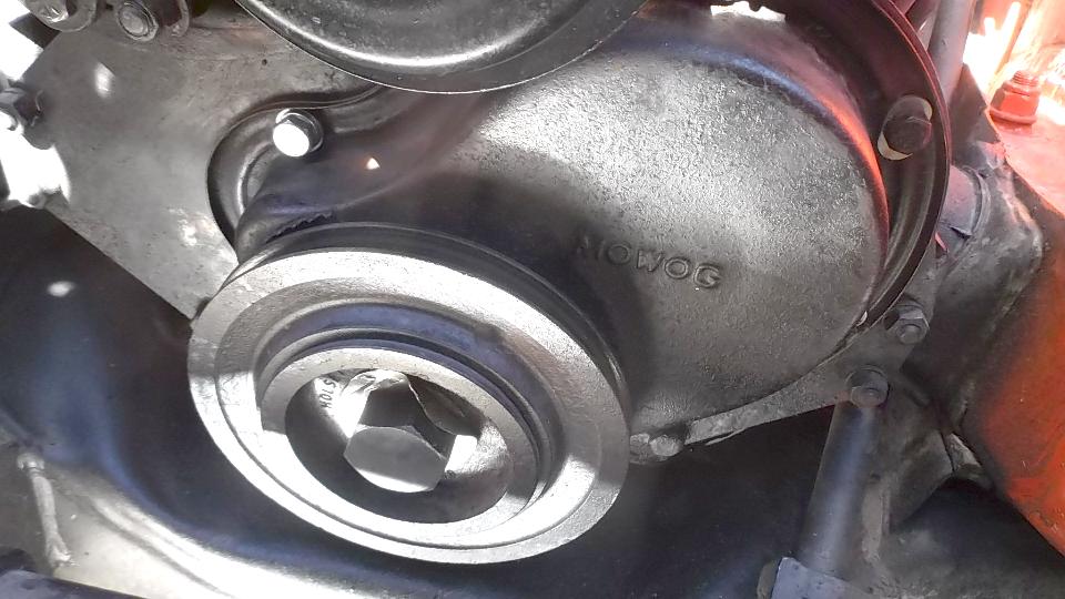 Oil the working edge of the seal. Place timing cover in position and install all bolts finger loose. Install crank pulley temporarily to center the seal while tightening the bolts you can reach. Then remove the pulley for access to tighten the rest of the bolts. When cover bolts are all tight, reinstall the crank pulley with locktab and the crank nut. Tighten the crank nut (very tight), set the locktab into a divot on face of the crank pulley to prevent tab rotation, and bend the tab up tight against one flat of the nut. Reinstall valve cover and fan belt. Then we could fire it up and reset ignition timing, and it was done.