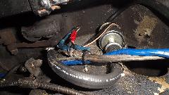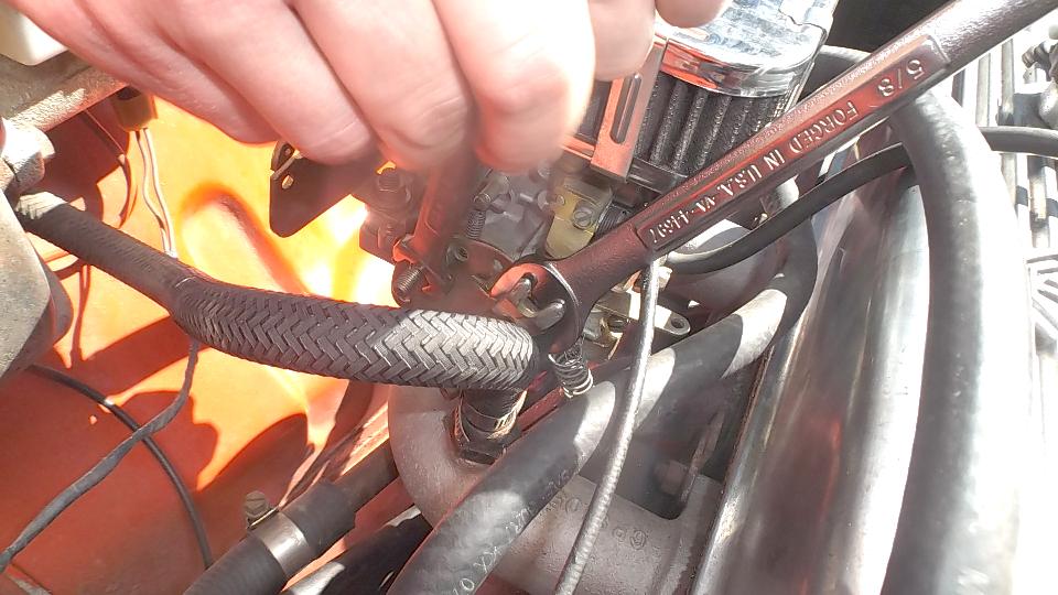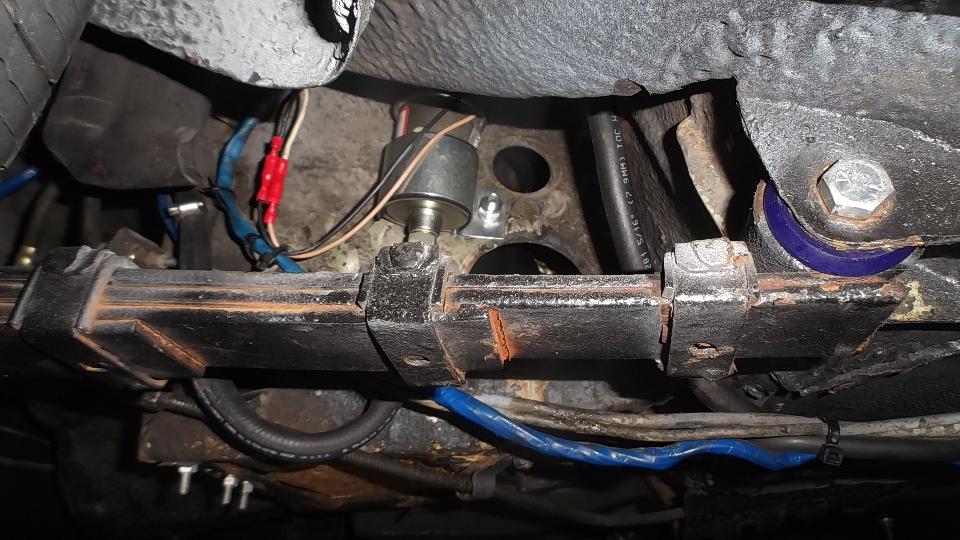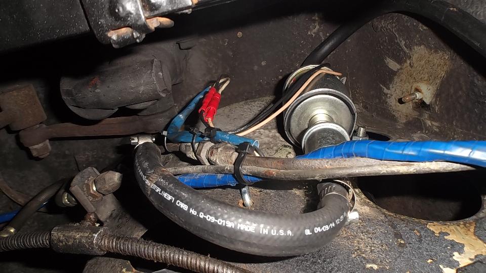 Then Keith was home so we could take another swipe at his MGB. He had recently done an emergency fuel pump replacement, like a parking lot swap with one wheel on a curb to crawl under the car. It was pretty good work under the circumstances, cutting tubing, connecting with hoses, and rather nice single contact connectors. But the new pump ended up below floor level where it may be susceptible to road hazard, so we were relocating it higher along side the battery box, with output end up as intended. I dearly wanted to install "L" fittings on both ends to have horizontal hose connections, but had no such parts in hand (late night).