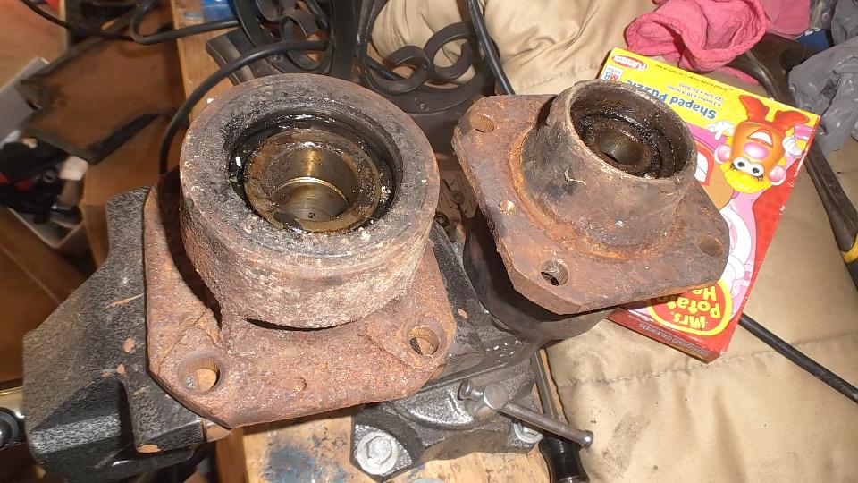 As the party was thinning out I took the opportunity to drag out the crusty front bearing hubs I had picked up a week earlier. Pull out the seals, knock out the bearings, scrape out the dried grease, drill out the broken 1/4-inch screws, brush off most of the rust, and give them a generous coat of black paint. I will take this up again after the paint dries. Back to WiFi for the evening.