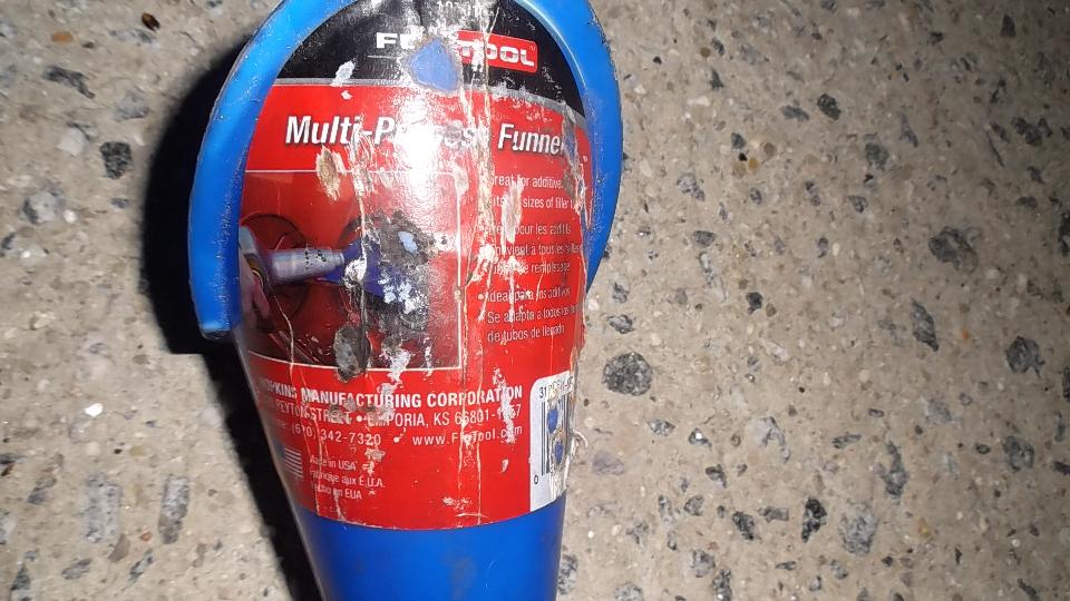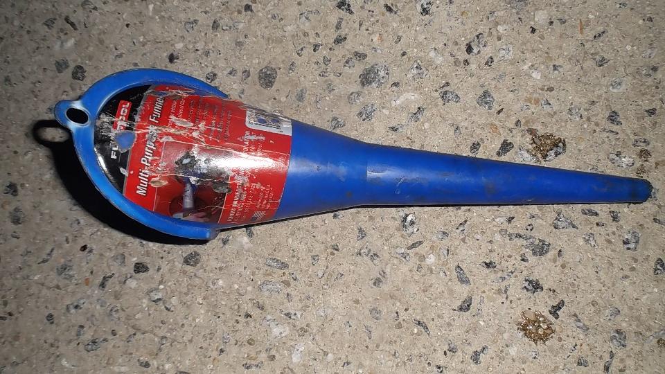 Picking up tools as it was getting dark, but with a bit more time available I managed to change oil in the gearbox (by flashlight). Getting better at this with practice and with the help of a nifty little funnel I picked up about a year ago. People have been asking about this one, so I need to post in in the Tools Tech section. Hopkins Manufacturing Corp, Emporia, KS, USA. I don't know the manufacturer's part number, but I picked it up at Walmart for cheap.