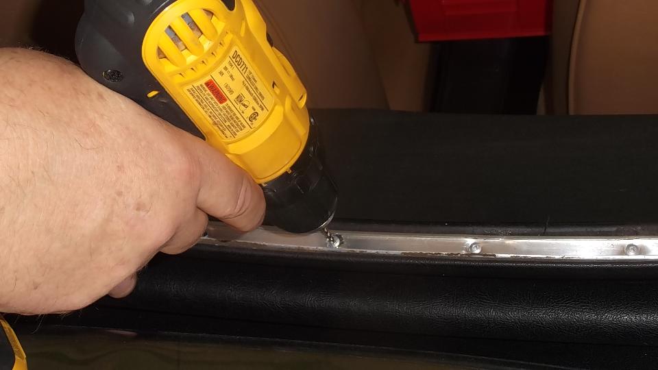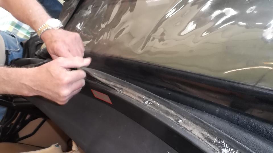 Start by pulling out the rubber front seal, then drilling out 15 pop rivets securing the seal retainer rail, then peel off the fabric from the header rail.