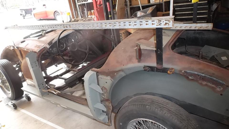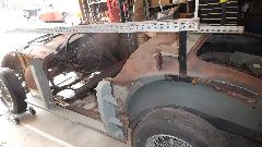 Next stop was an hour south to visit with Charlie Davis in Jackson, GA, who is restoring an MGA. The bolt-on channel is not a stiffener bar, but is a space reference for leveling the body sills. He is finding that the commercial "F" section sheet metal panels are thinner metal than original and do not fit well.