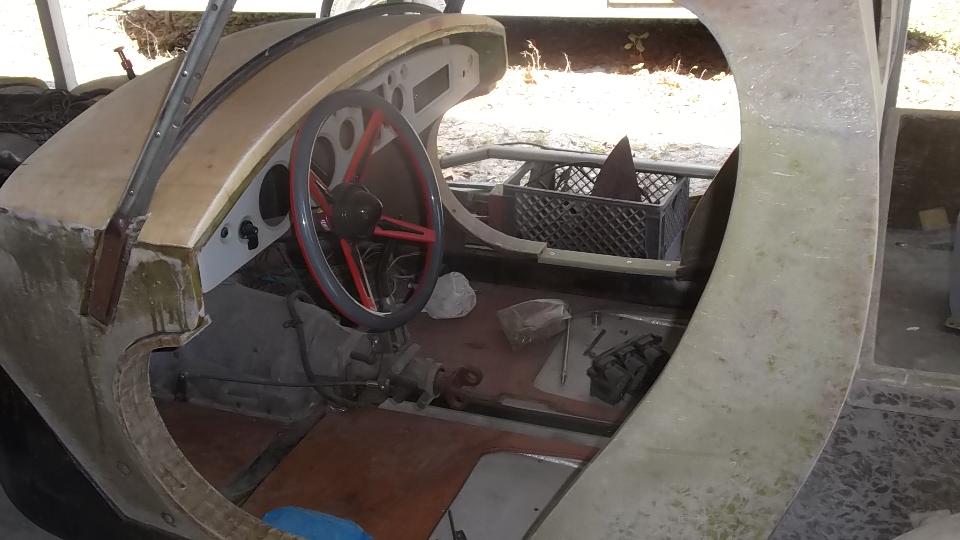 To clean up the engine bay, the master cylinder is relocated below the floor. The seat base is recessed into the floor to be flush with bottom of the frame. The alloy valve covers are just a nice touch of accessories.