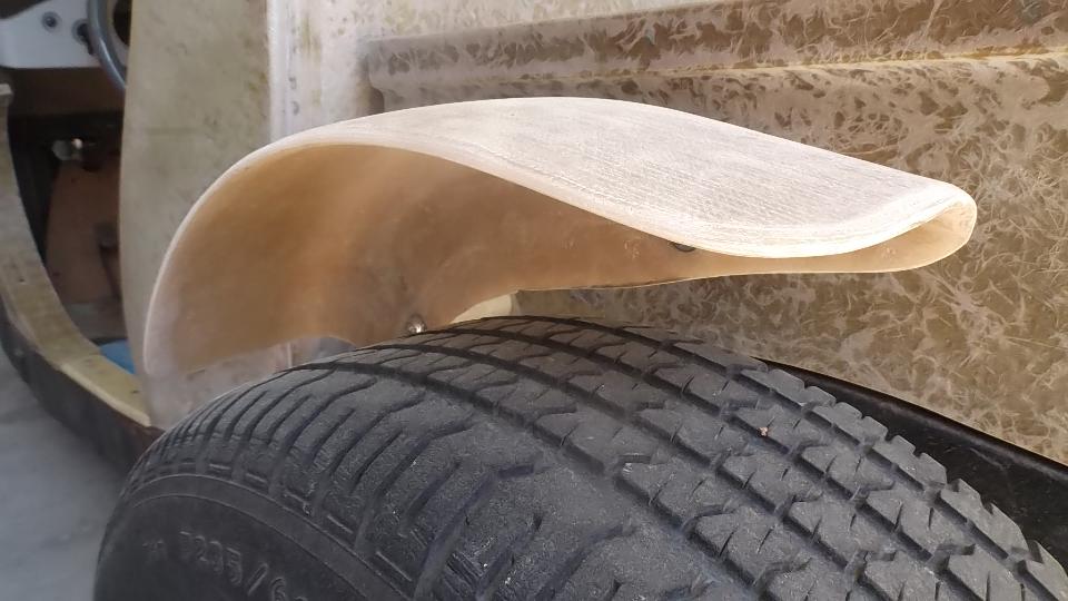 Most of the body is being fabricated from thermoplastic foam board, to be covered later with a fiberglass skin. The board only bends a little bit. For greater forming it can be scored part way through from both sides, and after forming to be filled with epoxy resin to hold the shape.