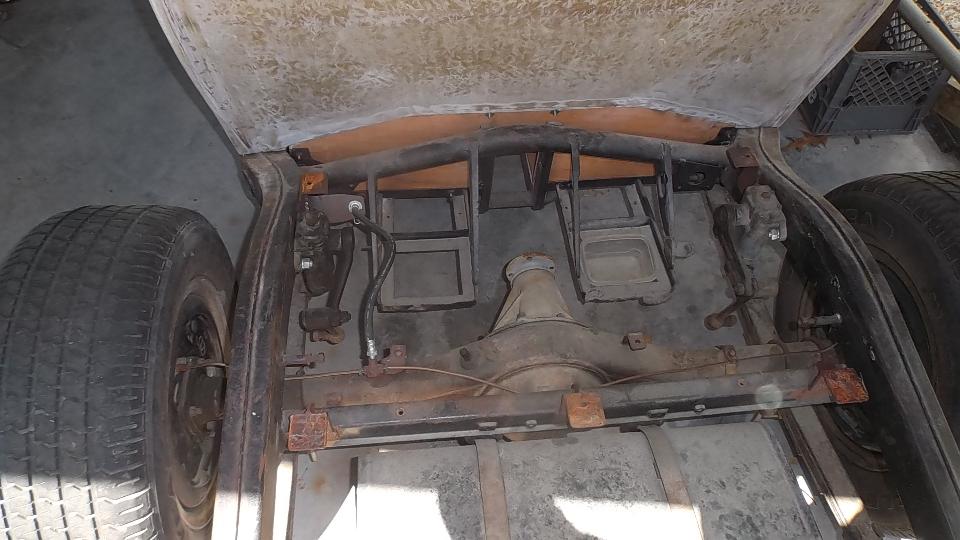 Off to an earlier start today (relatively speaking). By 1-pm we had the LF suspension disassembled, re-bushed, and reassembled to the same point as the RF. Then we jacked the rear and removed the wheels to get a start on rebushing the leaf springs. Keith wanted to notice the emergency bonnet release cable running from the bonnet latch to inside the LF wheel arch. But Keith had a couple more afternoon appointments, so that's about where we were temporarily stalled.