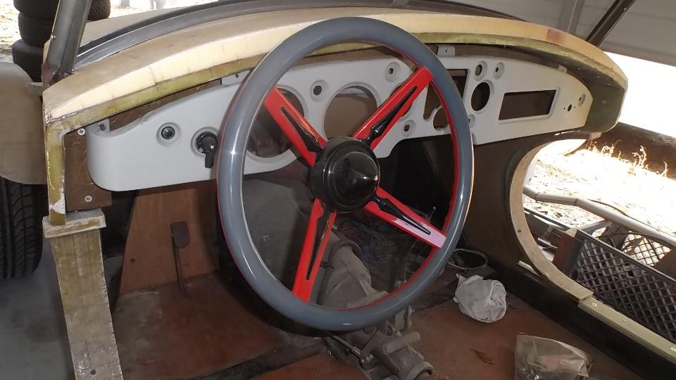 Where mechanical fasteners are required, the foam board is reinforced with hard polyethylene blocks. Thinner parts (like fenders) are built up with multiple layers of fiberglass cloth and resin. The dash panel is an original MGA Coupe part.