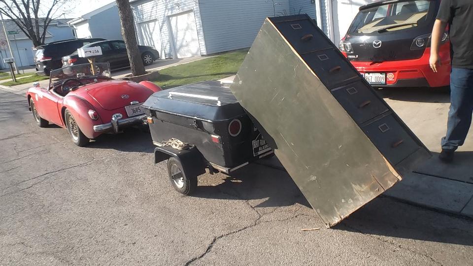 Gas up and give the new cylinder head its first work out. Mid day run 58 miles south from Crystal Lake to Romeoville, IL, to pick up a few more tools from my storage locker. We also picked up a little care package which we would deliver to Seth Jones, 22 miles back north in Glendale Heights, IL. It doesn't look like much on the outside, as it is a WW-II vintage wooden 4-drawer file cabinet that may weigh 75 pounds empty. The trick is,