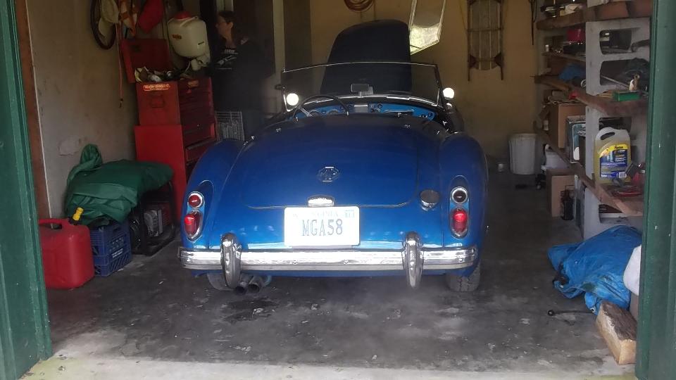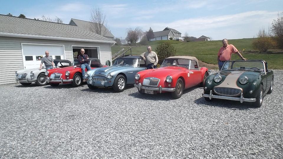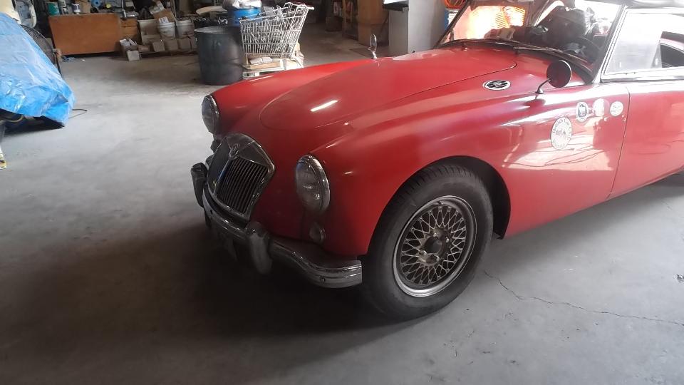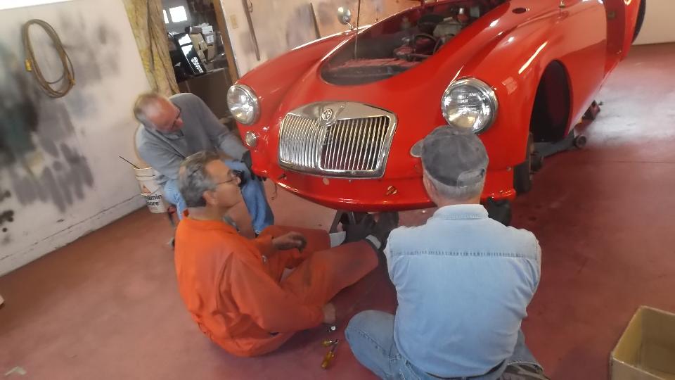 Slept in a bit but up by 10-am, late morning brunch, couple of phone calls to summon friends, and head for the workshop. Friends arrive shortly. Dick Bussler and Bill Bussler on the left, Dave Cappa in the middle, and Dave Strickler on the right. My MGA gets a quick mop down before we start working on it, revealing the real reason we are here. These four blokes have volunteered to help fix the rust (long story) on the left front fender (among other things) and repaint the car.