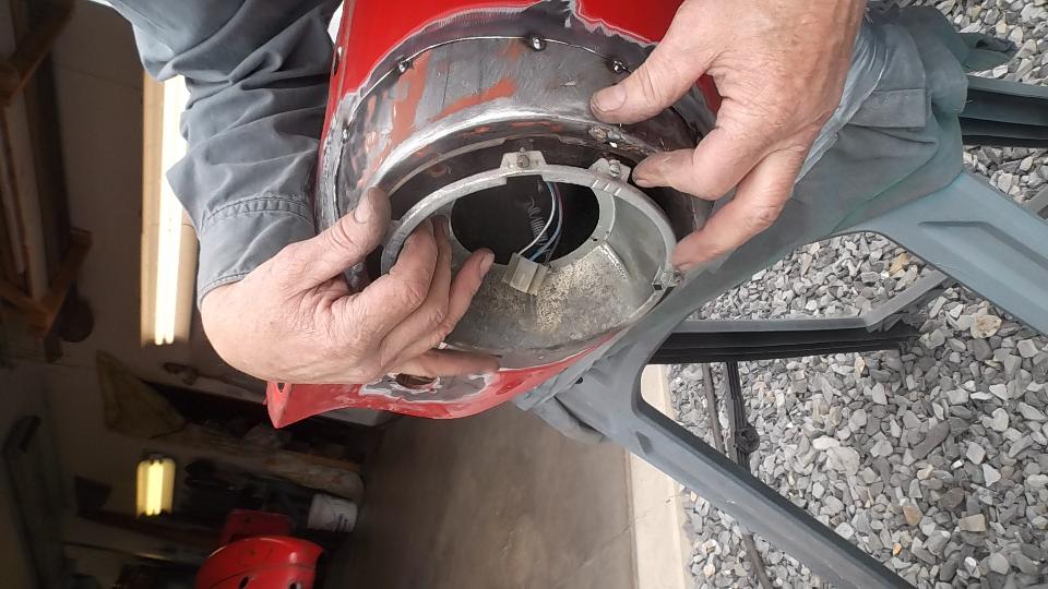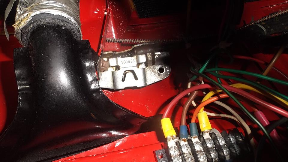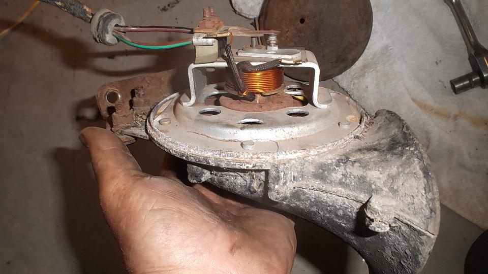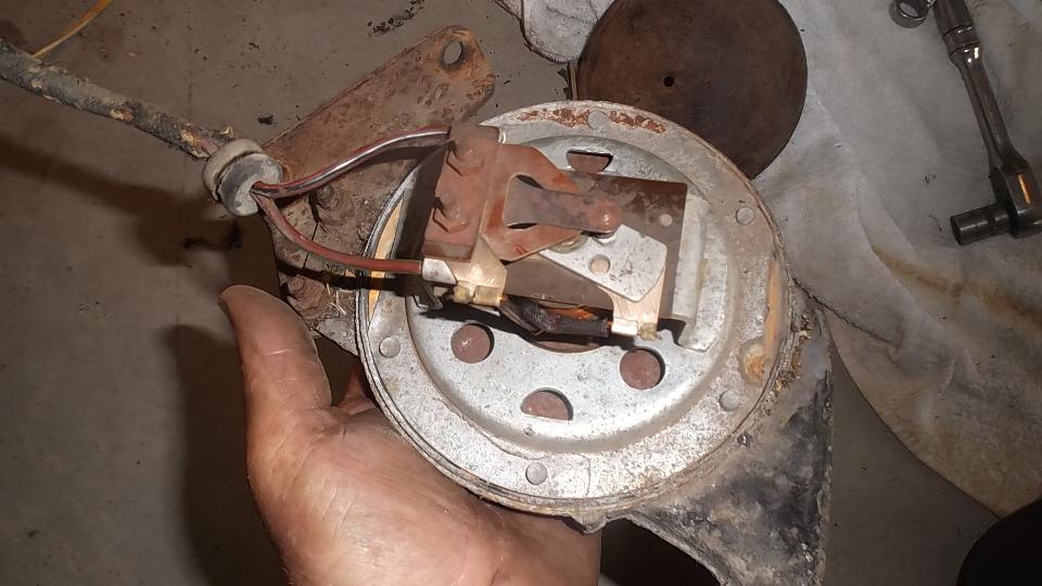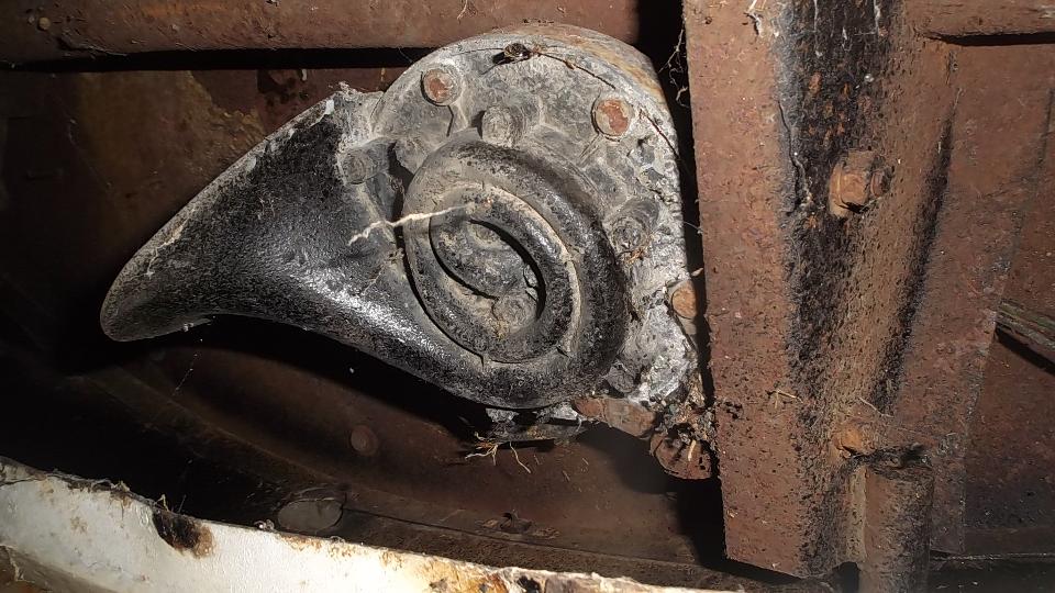 Finally getting on to the electrical issues, we attacked the non-working horn ("hooter" to the Brits). Five minutes with the test light reveals good power on the horn feed wire at the fuse block, and good grounding contact at the horn button, so the problem must be in the horn itself. Having to dismount the horn to get at the internal bits, those two rusted bolts turned out to be a real chore, as the bolt heads were nearly inaccessible above the L-bracket. That done, one screw pops the cover off, and we soon had the contact points cleaned to make it work, and all back together in short order.