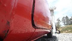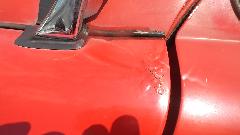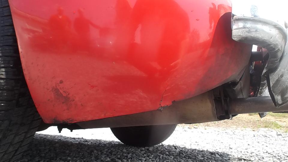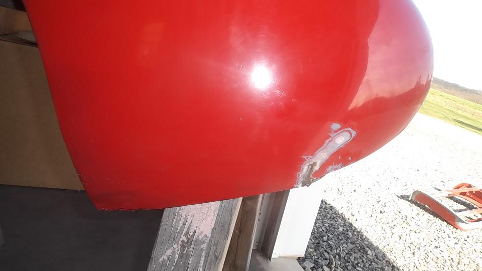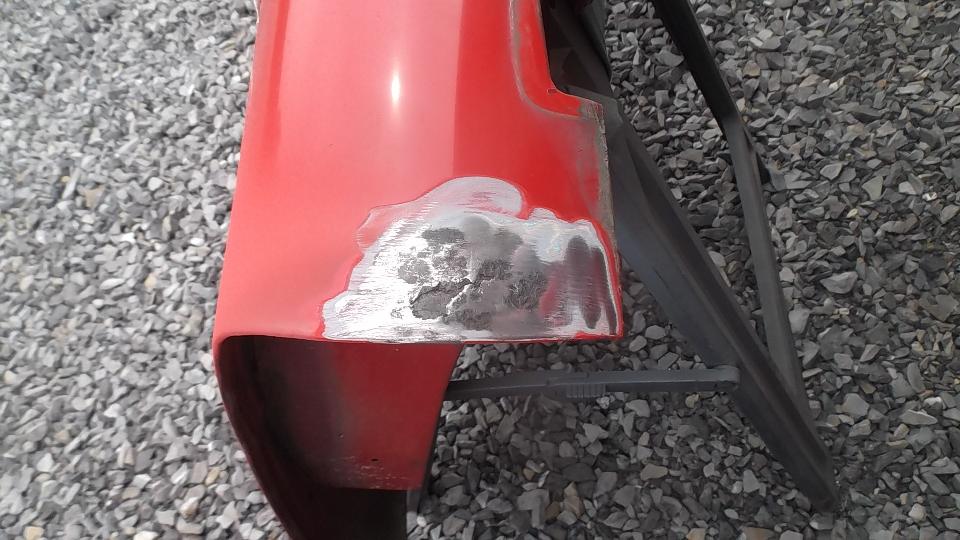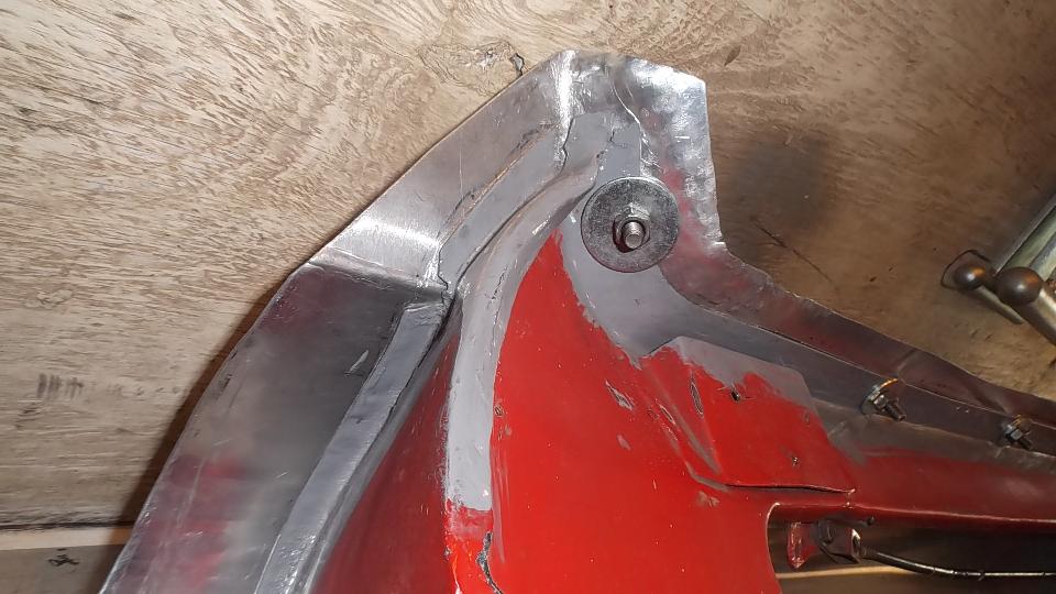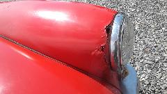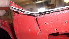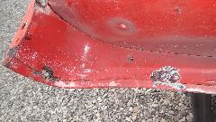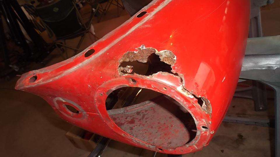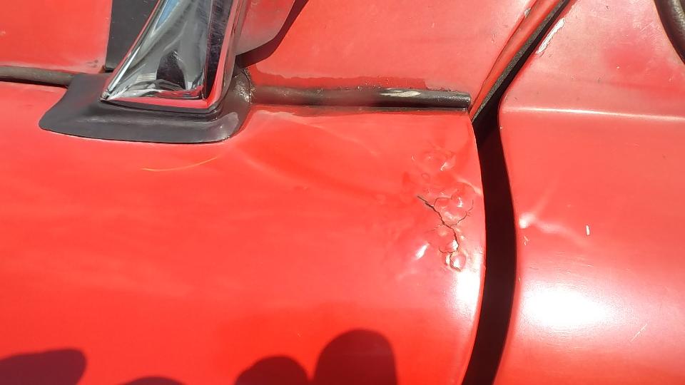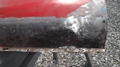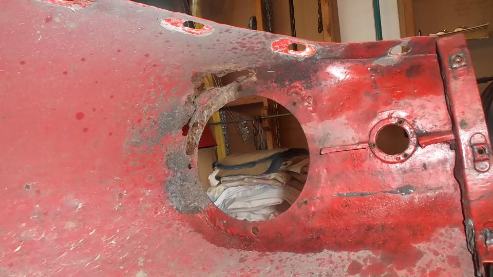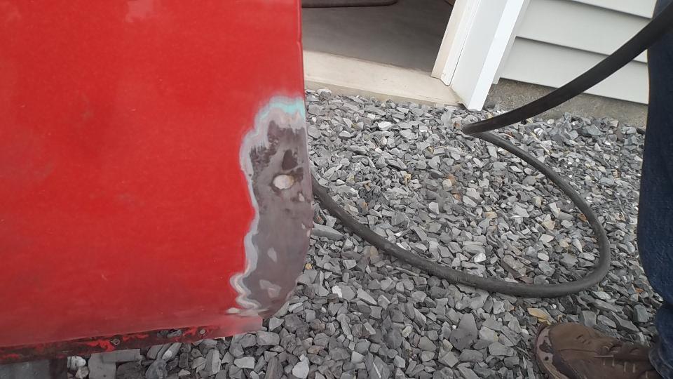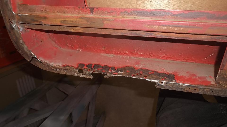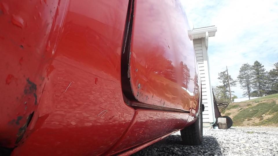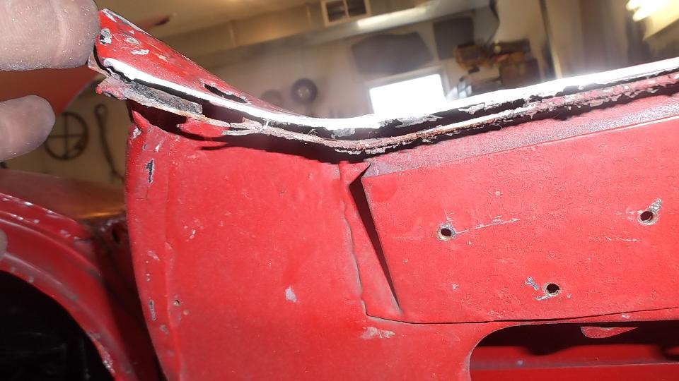 A bit of rust popping through on top rear of LF fender at a fold over joint that could never be painted inside. A bit of damage at bottom of LR fender as a result of running over a parking curb on a dark and stormy night. Passenger side door skin coming loose where the fold over flange has fractured.