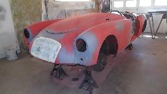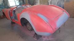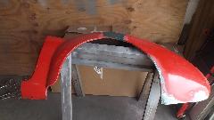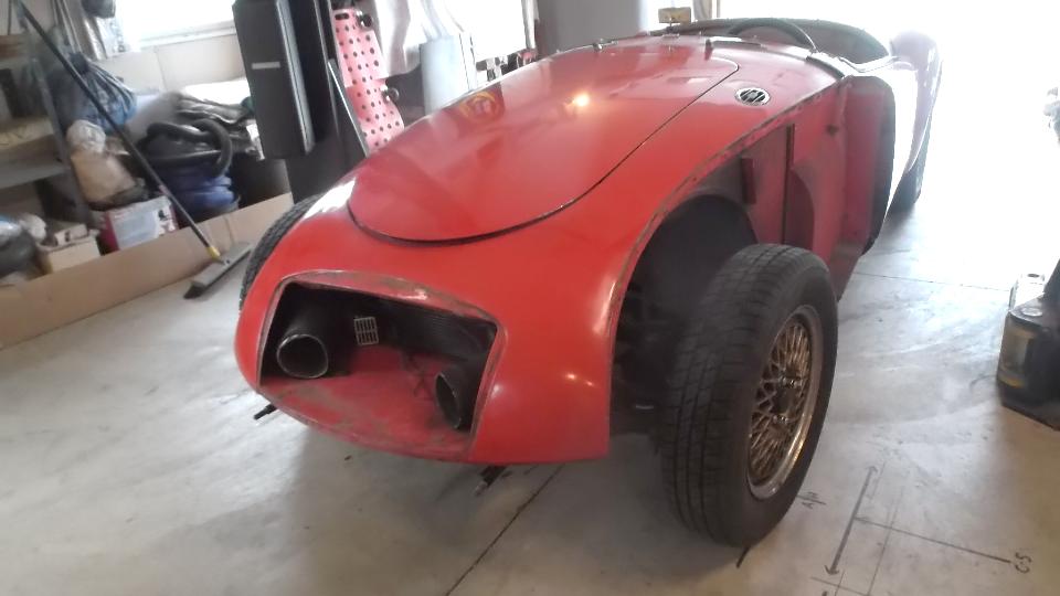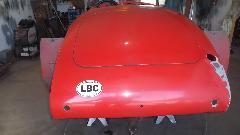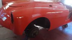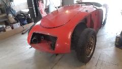 Interesting to see the replacement patch was a piece cut from an MGB quarter panel repair section. I swear this MGA is gradually morphing into an MGB. There was a bent flange on the new part that was too narrow, so it was flattened and re-bent with larger flange before trimming and welding into place. At day's end this fender was getting a bit of smoothing over with Duraglas at the weld zones.