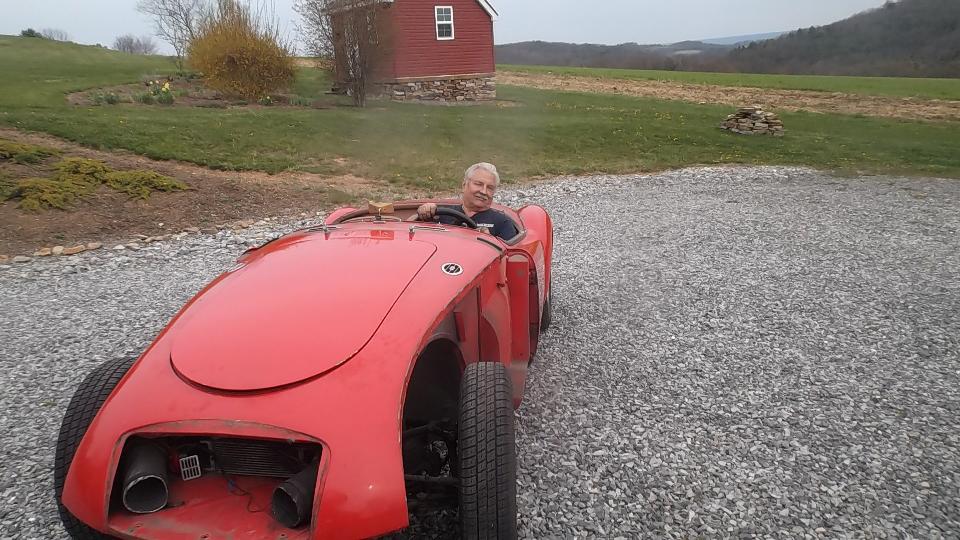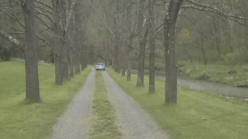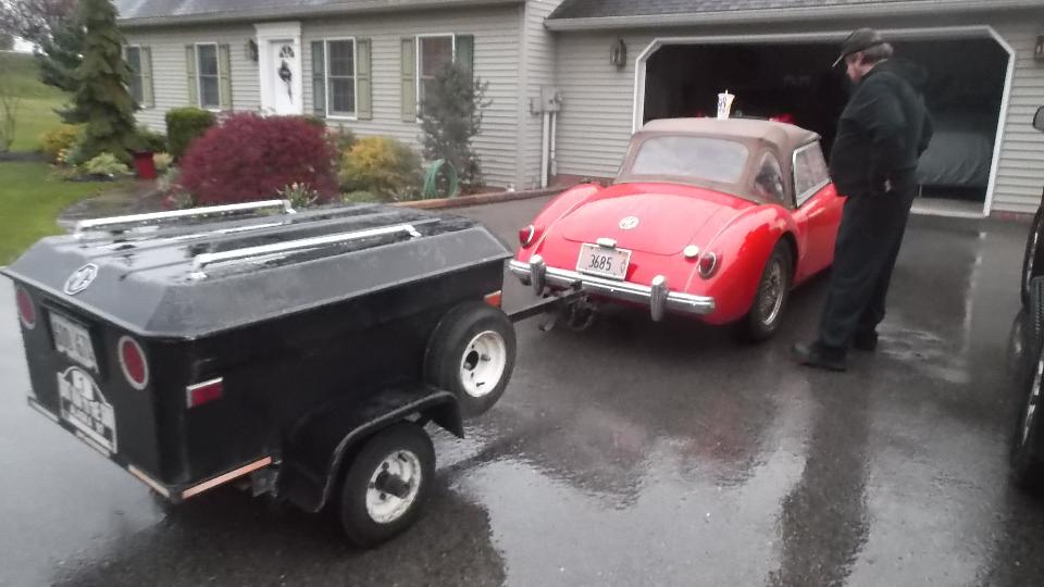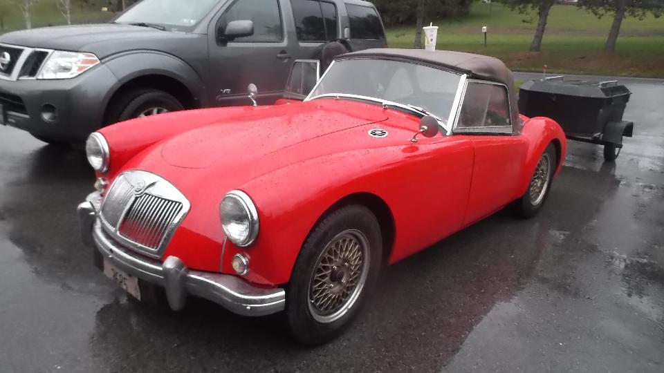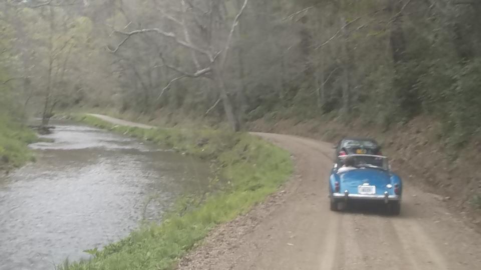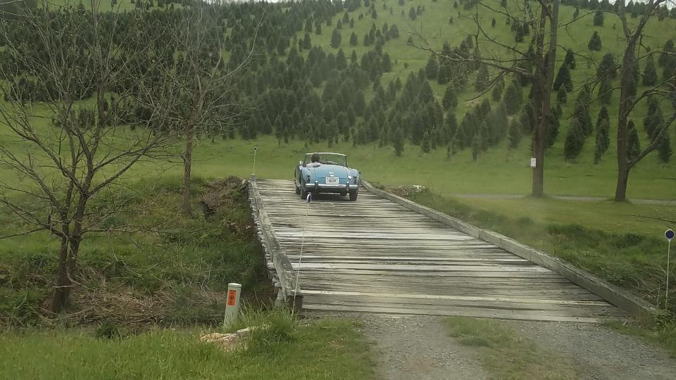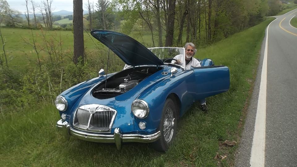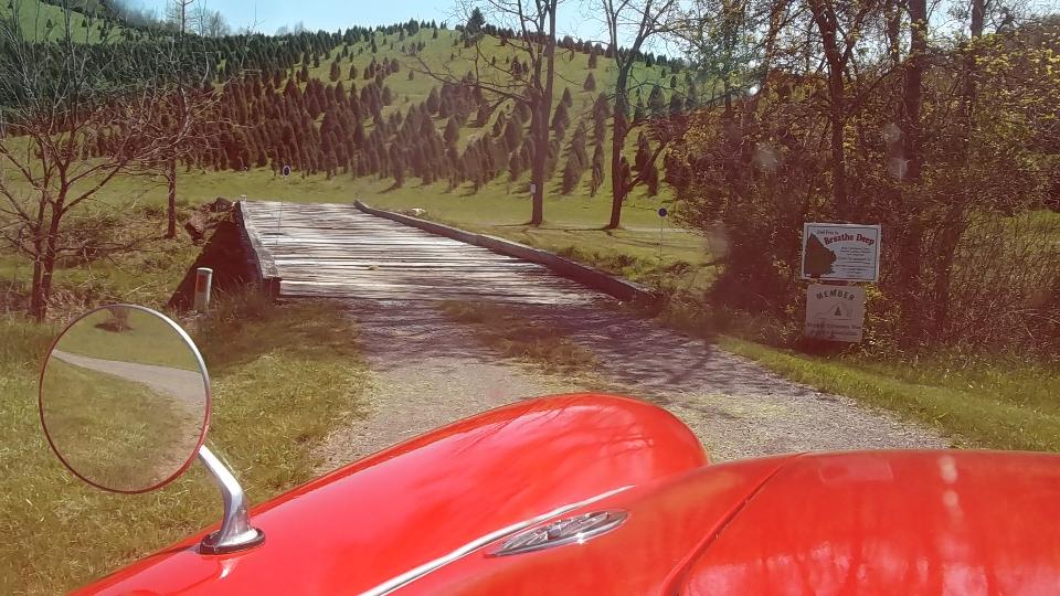 We must have slept well, as one hour farther along we were in Harrisonburg, VA for lunch and another WiFI session. By 1-pm on down I-81 again, and by 4-pm we were in rural Hillsville, Virgina, nearly 450 miles from last evening's departure from Pennsylvania. We were here to visit Billy Cornette who has a 1958 MGA 1500. He also has a very quiet 75-acre valley in the mountains where he grows Christmas trees. Getting there was a bit of a challenge with winding tarmac roads in the hills followed by half a mile of narrow and twisty gravel road, followed by a twin track winding driveway over a wooden bridge and through a tree lined lane and up a steep grade where the MGA had a challenge to tow the trailer up in 1st gear. But of course we made it up.