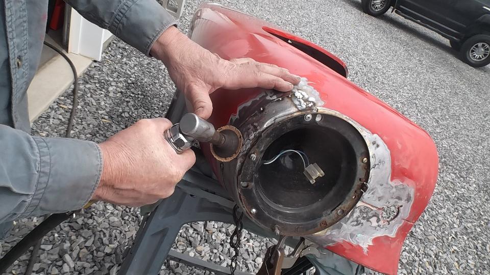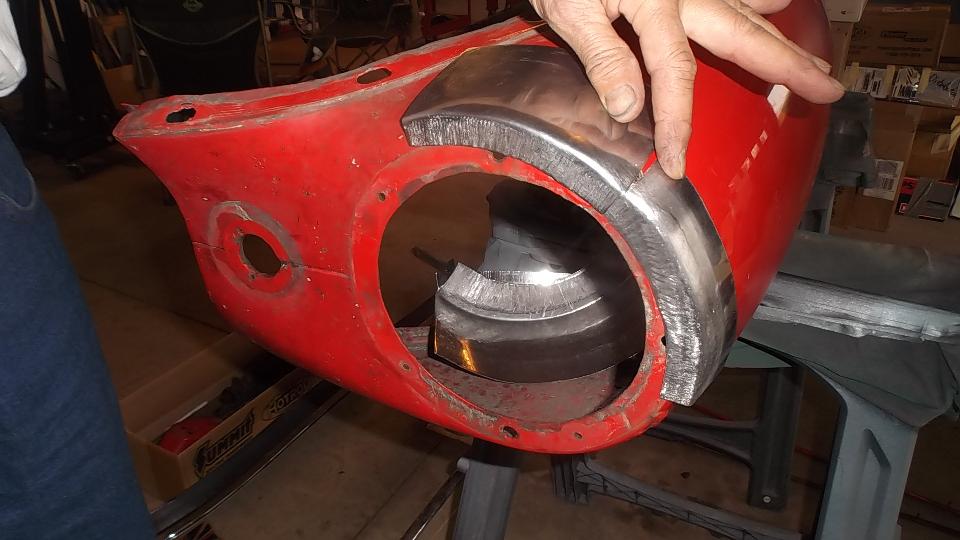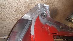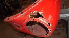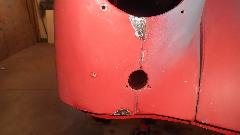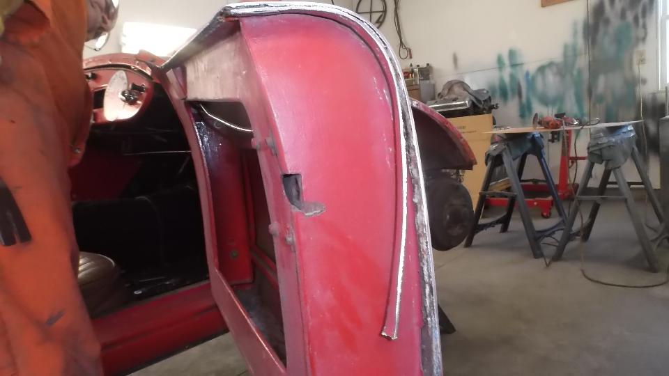 Meanwhile on the other side of the shop Dick Bussler has been busy repairing rust in the left front fender. A few small spots had a new bit of metal tacked into the outer skin. One area at the bottom with a bit too much "Swiss cheese" received a larger replacement patch.