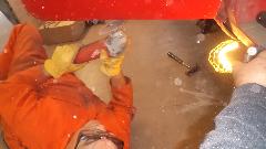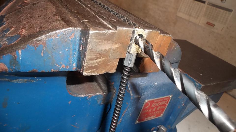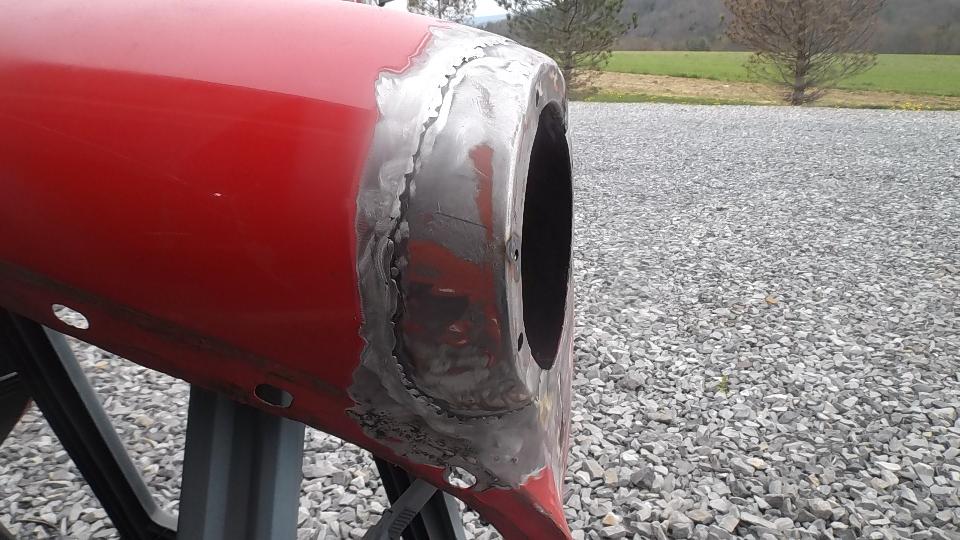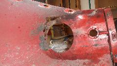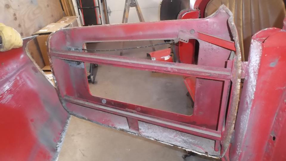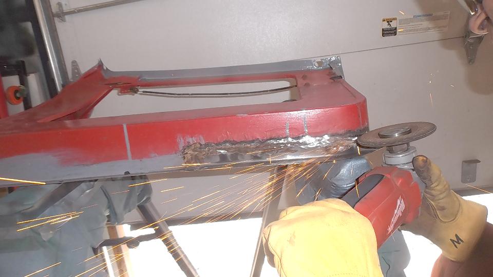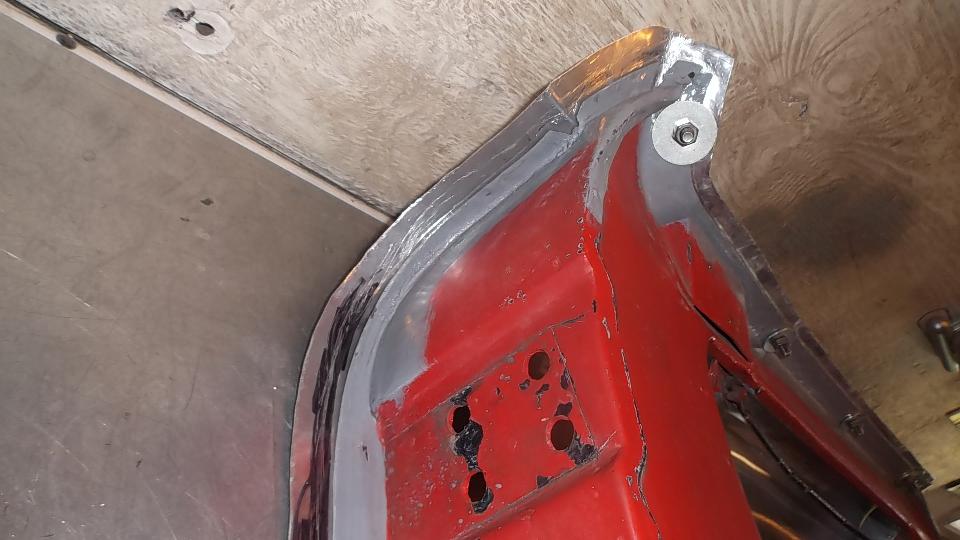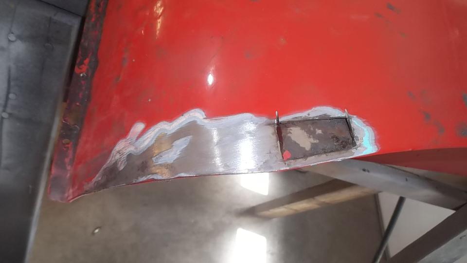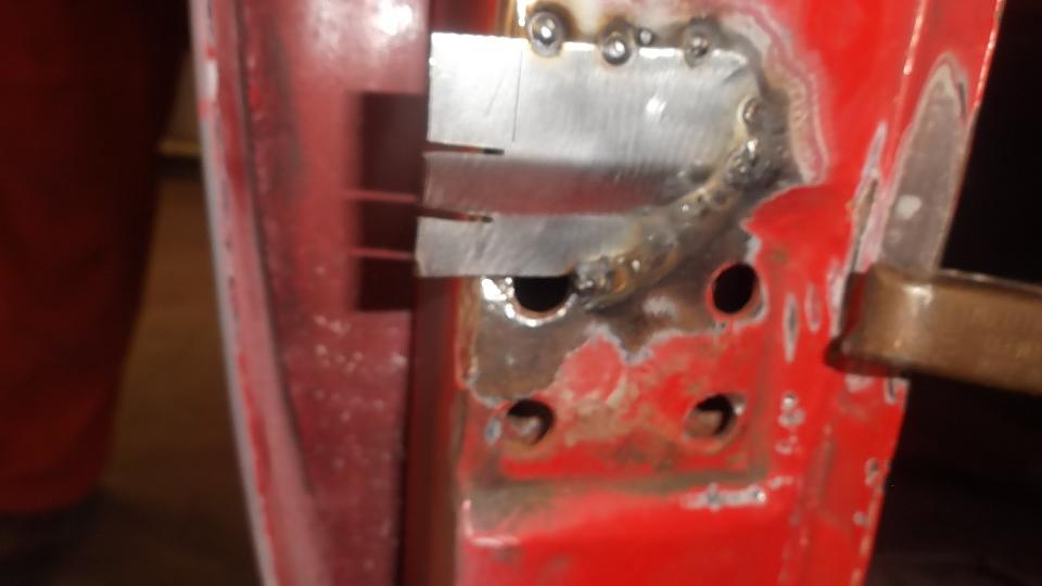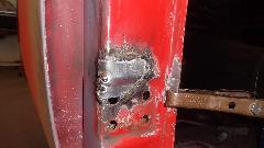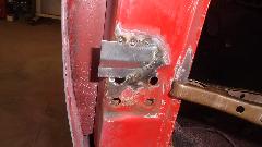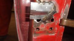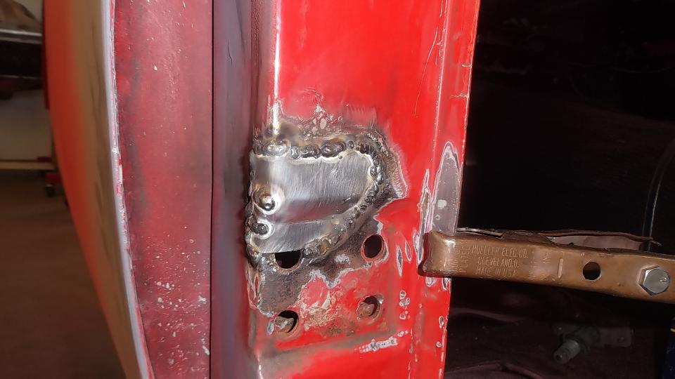 Then there was one more small rust repair (always another one of those somewhere) in an unusual location. This one required drilling out one door hinge screw, plus welding, grinding, drilling and re-threading the tapping plate. After grinding the new patch, this one will be good to go. Would you believe red paint tomorrow?