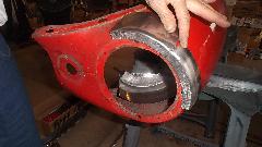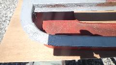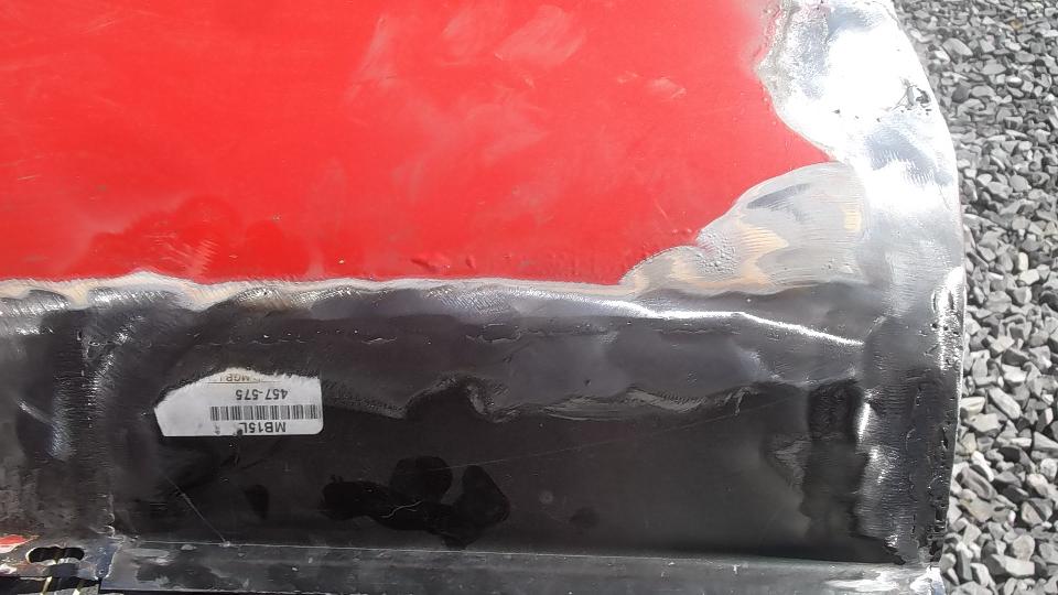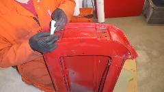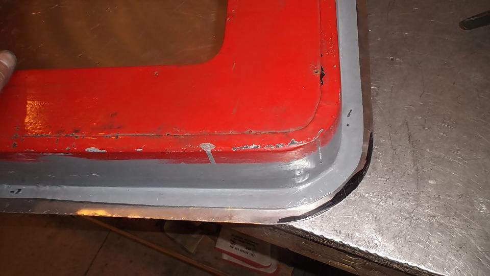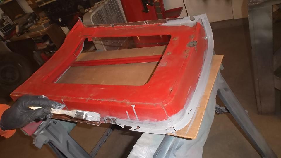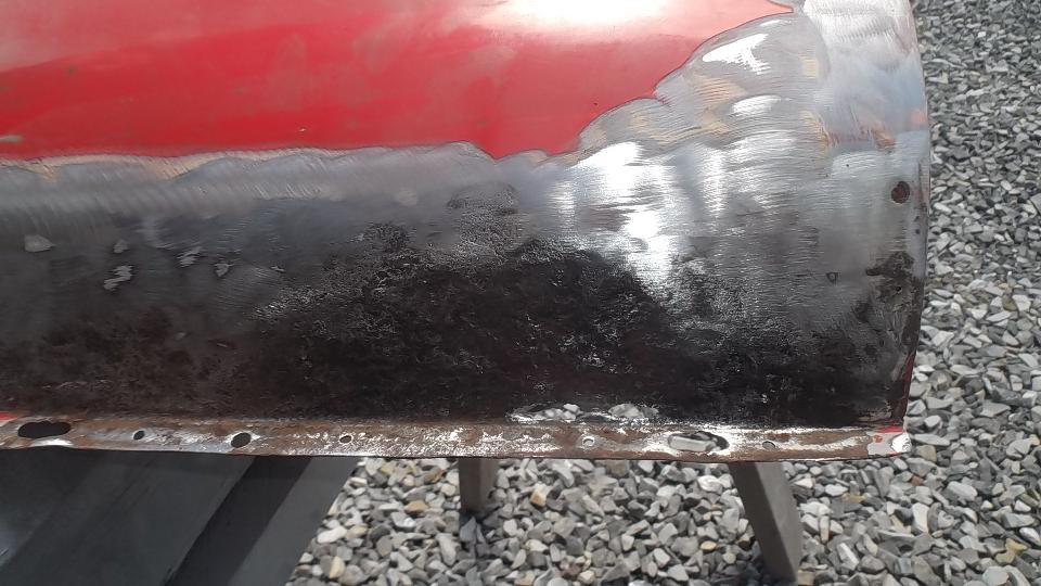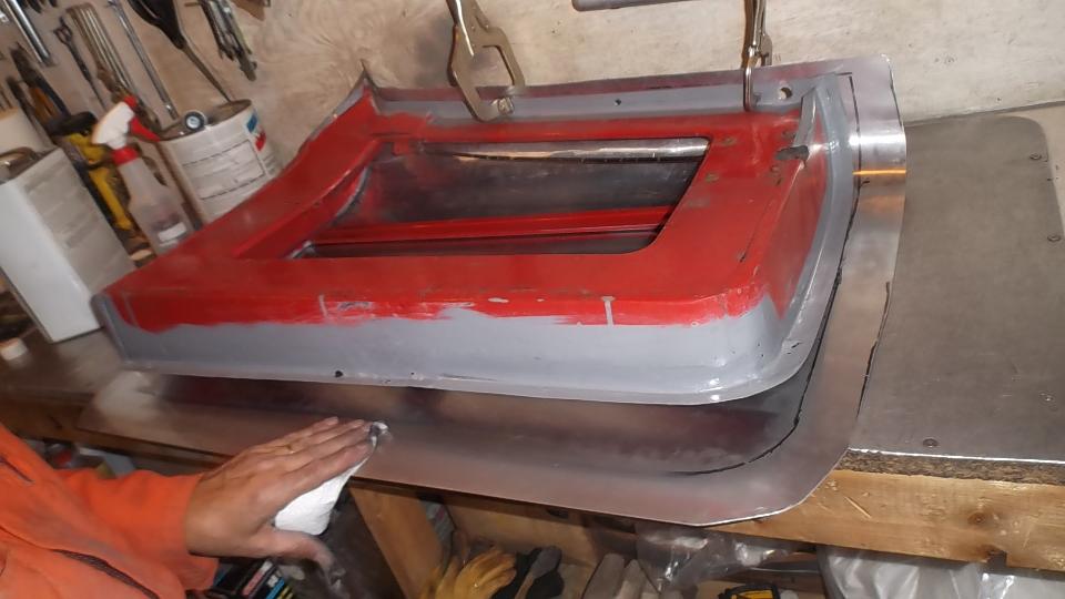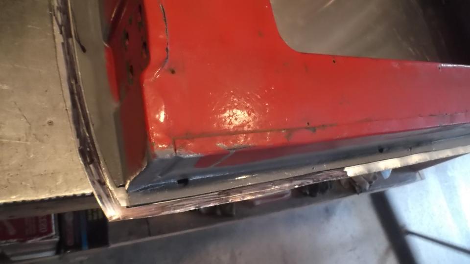 Trim the door shell to accept the new piece, then a bit of MIG welding and some grinding, and the door shell is ready for some epoxy primer.