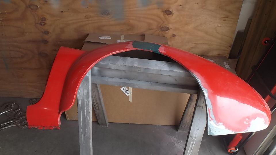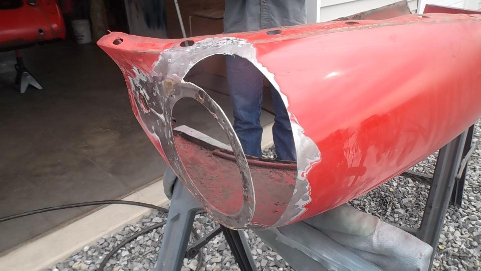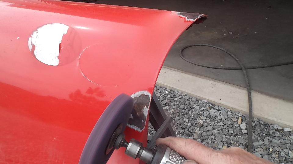 That's coming along fairly well, rust gone, new metal in, needing finishing work. Then a few break-outs along the rear edge of the same fender, buff out most of the rust there, and set this aside for the day.