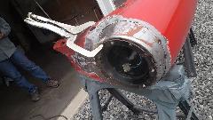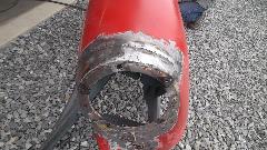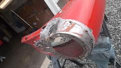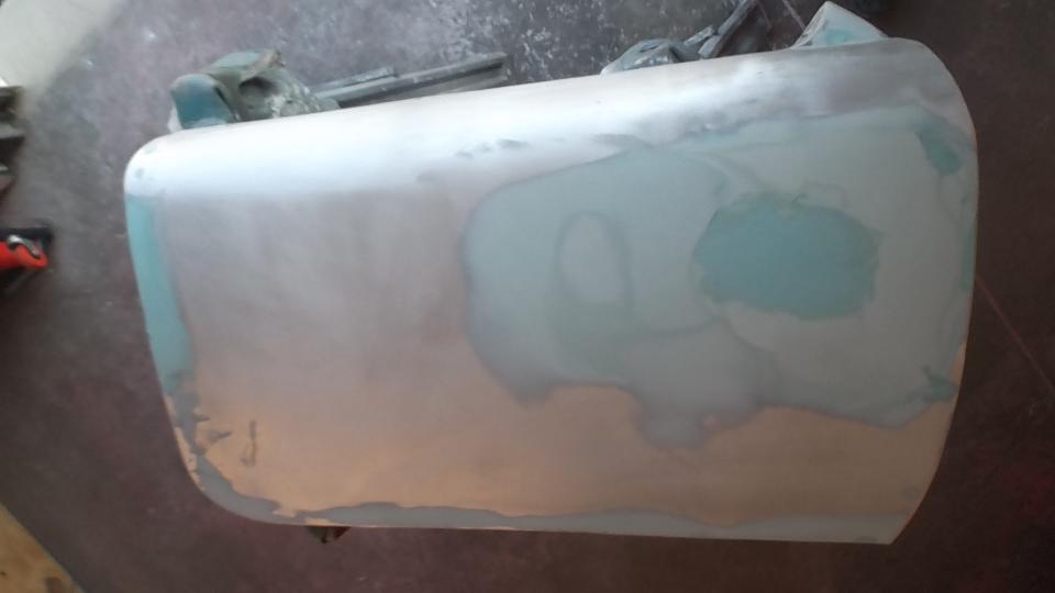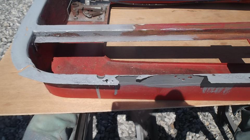 A flat sanding flap wheel on a 4-inch angle grinder makes short work of cleaning up the corrosion. A bit of metal replacement will be required along the bottom edge before reassembly. For now it gets a quick coat of epoxy etching primer before the day is done.