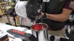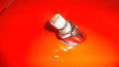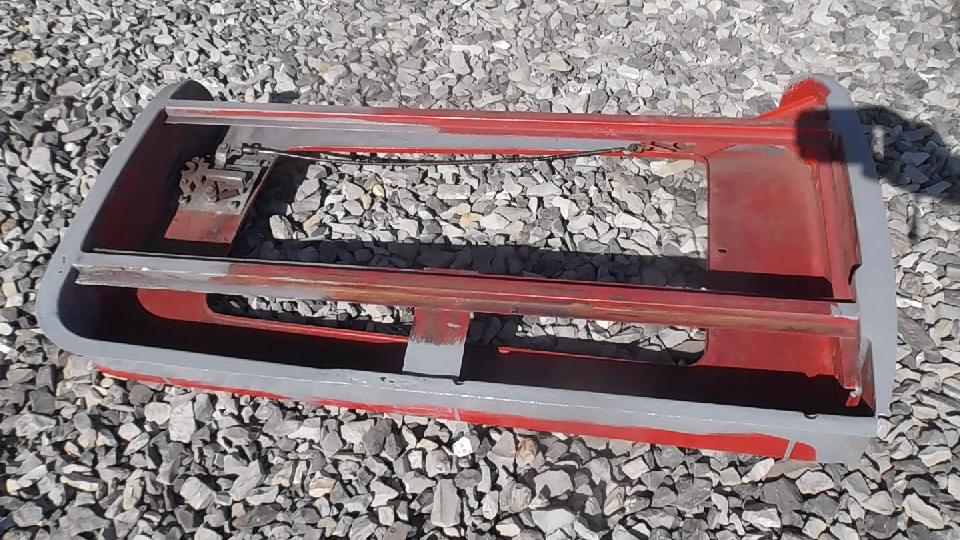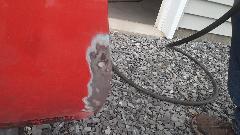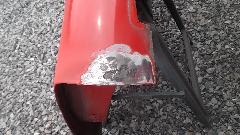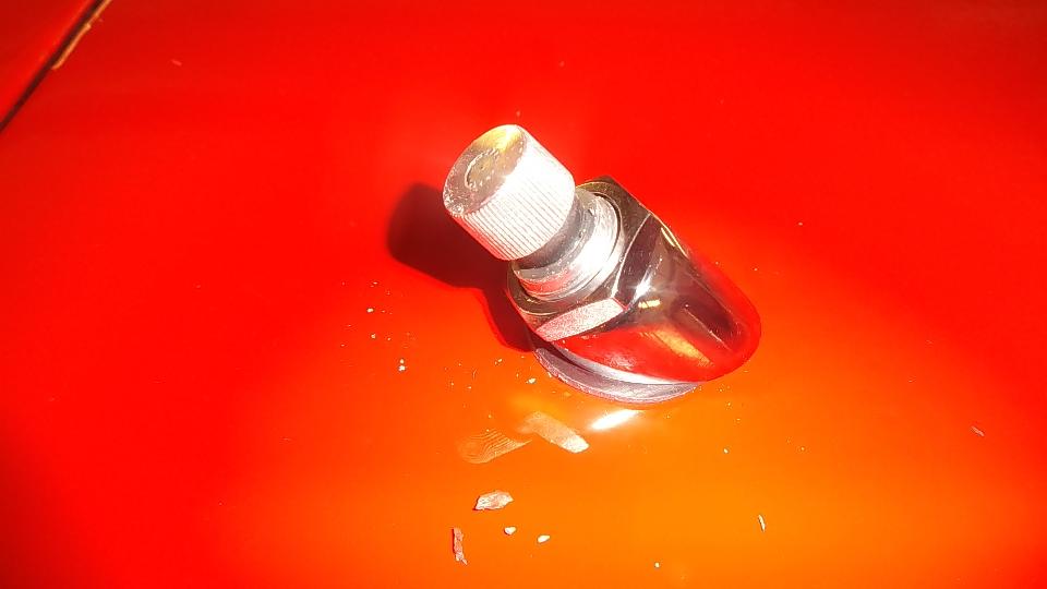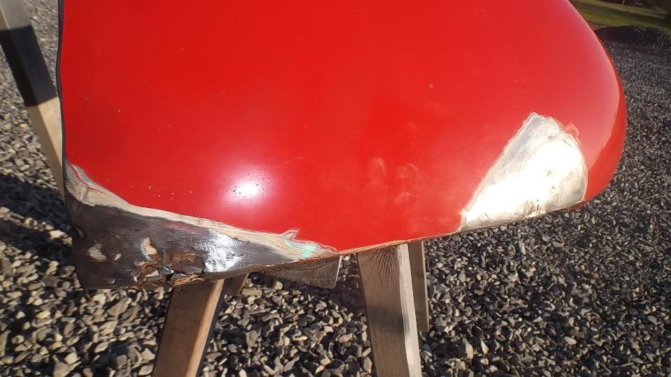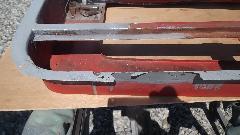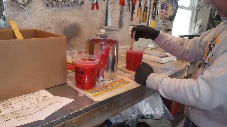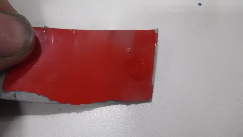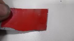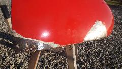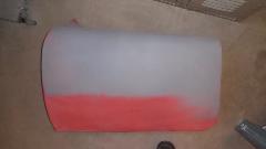 How many colors do you mix to basic red paint stock make Orient Red (or something equivalent)? Try Red, White, Black, and Clear? I don't recall what the clear stuff was. On the original sample part below the paint dot at right end of the part is the new paint sample. Near as I can tell, it is a dead on match to the eight year old faded paint (not as light as the original color would have been when new). Then back to the shop for cleaning and sanding and spot priming in preparation for painting.