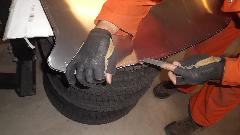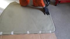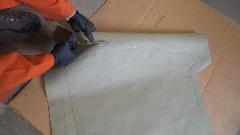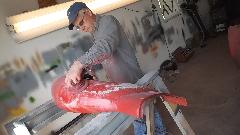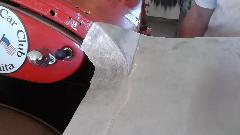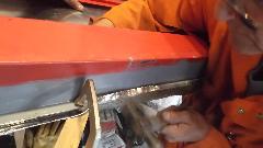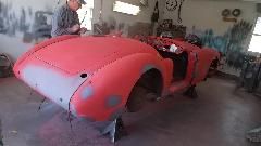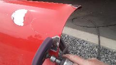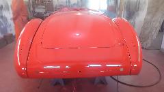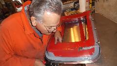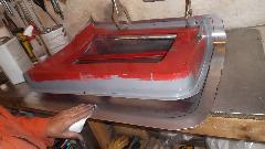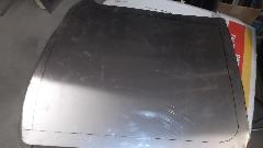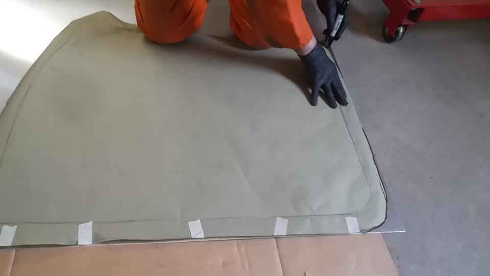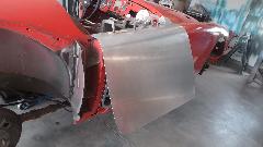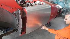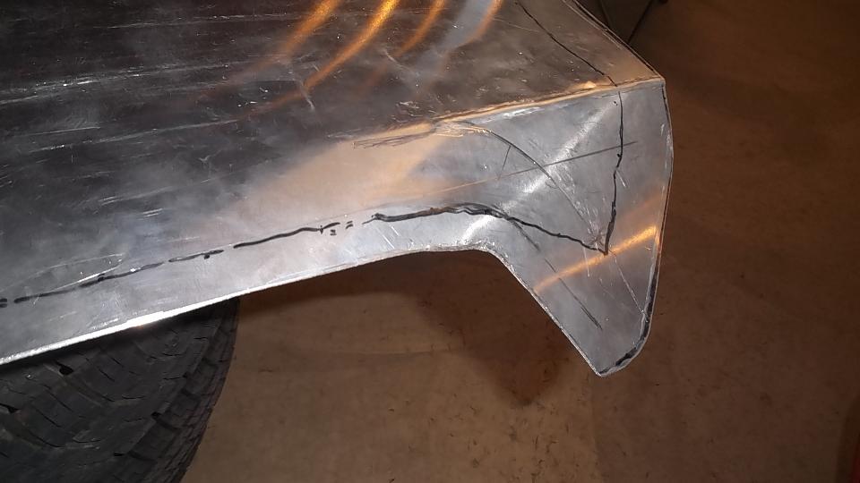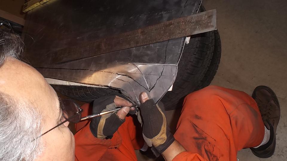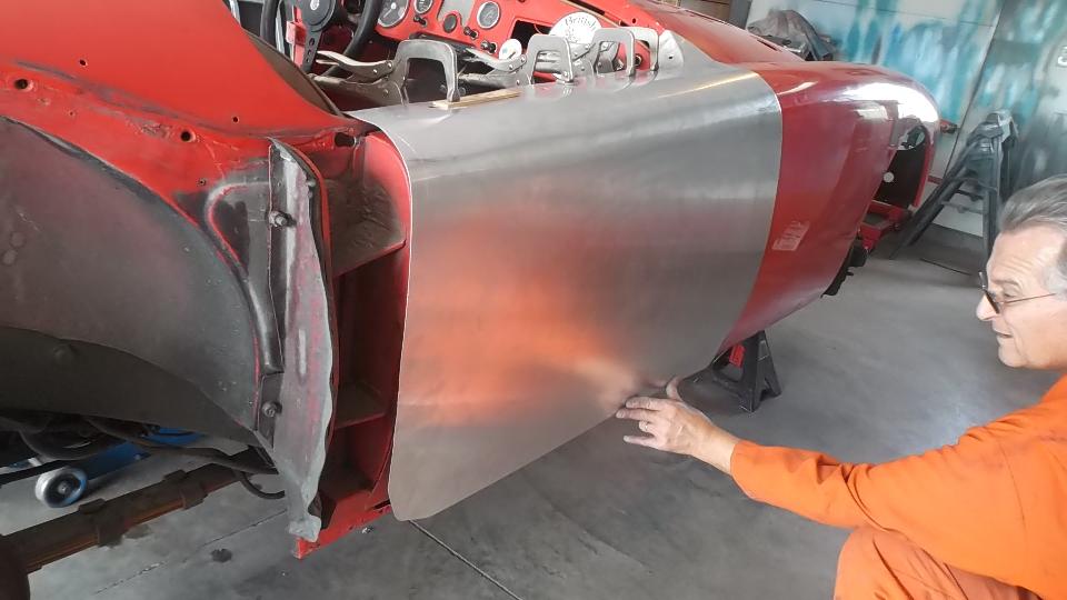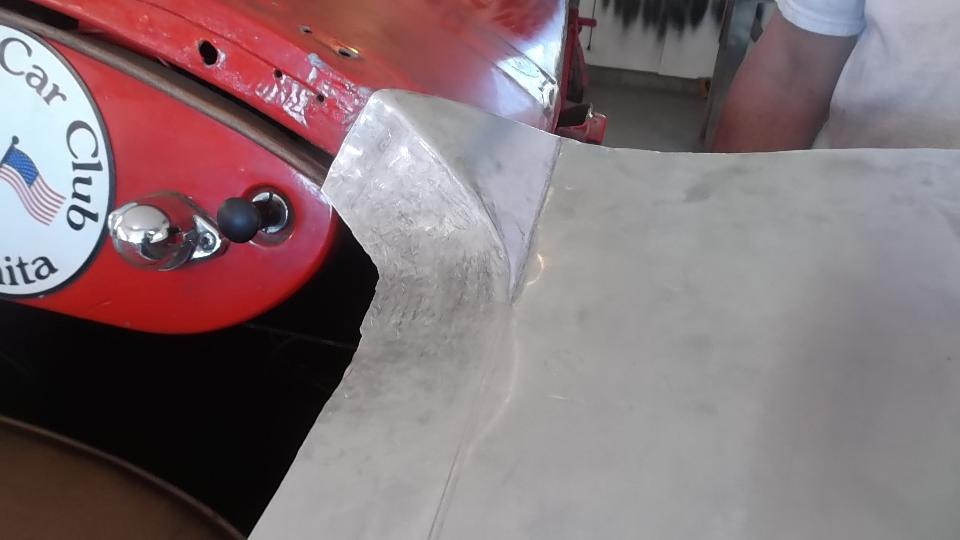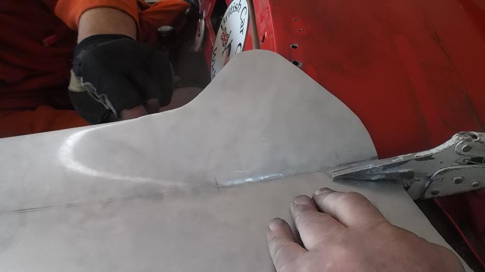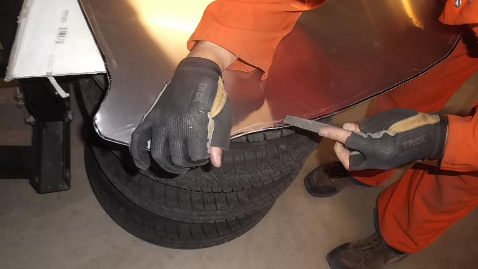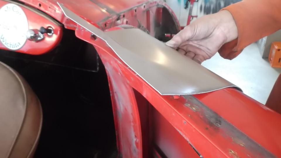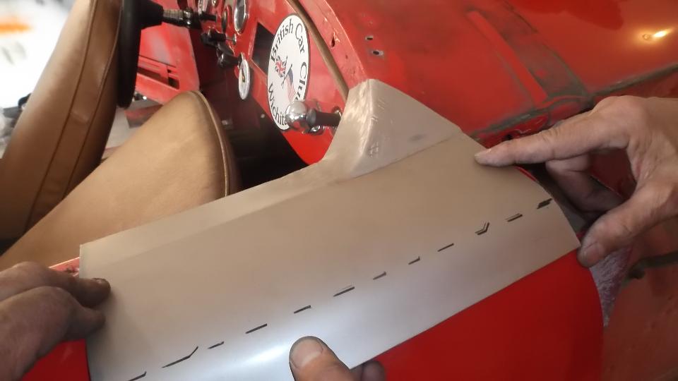 During the forming process the sheet is brought to the car many times for fitting reference. When it is close to the final shape, the edges around the top corner formation can be trimmed closer to the finished size.