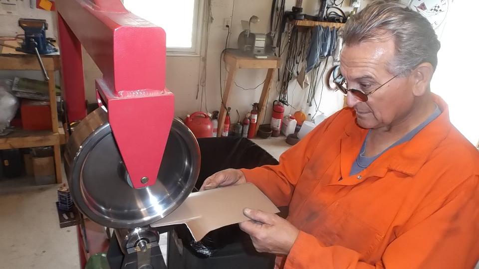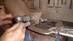 Notice use of the rounded cross pien hammer used to "stretch" the metal in one direction only by hammering it progressively thinner. Dave Cappa is also a bit of an artist using the English Wheel while I get to be the student.