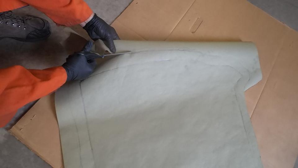 Enough playing around with the big boy toys and practicing. Now we know we can make a panel the proper shape by forming it from flat sheet, so it is time to do it for real. We place the door on a paper sheet and trace around the edges to make a paper template. Being somewhat difficult to trace around the protruding top corner, we leave a generous margin in this area. Then draw another perimeter line with 1-1/2-inch margin all around, and cut it out with scissors. And clean the door to be easier to work with (and so tape may stick to it).